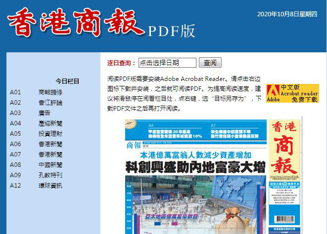| 網站簡介: 香港商報電子版,香港商報PDF版?!断愀凵虉蟆酚?952年10月11日創(chuàng)刊發(fā)行,是中國香港歷史最悠久的中文財經報章。數十年來堅守愛國愛港的立場,恪守公正持平、必盡言責、聚焦商界、服務社會的報格,以溝通香港和內地經貿往來為己任,多年榮膺“香港最受歡迎十大中文報章”。 |