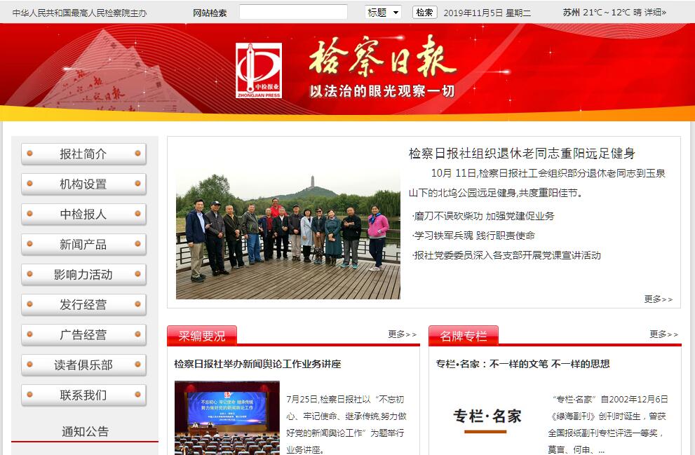 1991年1月11日,最高人民檢察院黨組決定,成立創(chuàng)建《中國檢察報(bào)》籌備小組。同年2月2日,國家新聞出版署批復(fù)同意創(chuàng)辦《中國檢察報(bào)》,由最高人民檢察院主管并主辦。4月12日,最高人民檢察院召開《中國檢察報(bào)》籌備工作電話會議,確定了“立足檢察、面向社會”的辦報(bào)方針。4月,鄧小平同志題寫《中國檢察報(bào)》報(bào)名。1991年5月25日出版了《中國檢察報(bào)》試刊號,7月4日,《中國檢察報(bào)》正式創(chuàng)刊。之后的五年,《中國檢察報(bào)》實(shí)現(xiàn)三級跳:1992年1月1日,《中國檢察報(bào)》由周一刊改為周二刊,每周一、五出版。同月,該報(bào)被中華全國法制新聞協(xié)會吸收為團(tuán)體會員。1994年1月1日,《中國檢察報(bào)》由周二刊改為周四刊,每周二、四、六、日出版。1996年1月1日,《中國檢察報(bào)》由周四刊改為日報(bào),更名為《檢察日報(bào)》,檢察新聞實(shí)踐自此走向深入。2000年1月1日,《檢察日報(bào)》正式擴(kuò)為八版,并在北京周邊地區(qū)出彩報(bào),對全國各分印點(diǎn)實(shí)行衛(wèi)星傳版。2006年1月13日,《基層采風(fēng)》創(chuàng)刊,自此,每月逢第二、四周三出版對開12版。從《中國檢察報(bào)》到《檢察日報(bào)》,從周一刊到12版對開日報(bào),《檢察日報(bào)》至今已出版近7000期報(bào)紙。創(chuàng)刊伊始,以劉佑生同志為黨委書記、社長的檢察日報(bào)社黨委班子,帶領(lǐng)檢察報(bào)人攻堅(jiān)克難,為報(bào)社長遠(yuǎn)發(fā)展奠定了堅(jiān)實(shí)基礎(chǔ),從最初“就檢察說社會,就社會說檢察”、“天天傳播反腐新聞 期期提供法律服務(wù)”,逐漸形成了“檢察新聞社會化、社會新聞法治化、法治新聞專業(yè)化”的報(bào)道理念。2005年,新一屆黨委班子在張本才同志帶領(lǐng)下,系統(tǒng)總結(jié)辦報(bào)經(jīng)驗(yàn)和發(fā)展理念,將“做中國最具影響力的法治大報(bào)”確立為發(fā)展的目標(biāo),科學(xué)分析新媒體時(shí)代紙質(zhì)媒體面臨的挑戰(zhàn),審時(shí)度勢,提出了檢察報(bào)業(yè)“一體兩翼”發(fā)展戰(zhàn)略?!耙惑w”就是以《檢察日報(bào)》及所屬刊物為母體;“兩翼”,就是以網(wǎng)絡(luò)和影視為引擎?!耙惑w兩翼”發(fā)展戰(zhàn)略,就是穩(wěn)步發(fā)展報(bào)刊母體,大力發(fā)展網(wǎng)絡(luò)、影視兩翼,不斷拓展發(fā)展空間,以兩翼帶動一體,實(shí)現(xiàn)整體發(fā)展。2011年10月,張本才同志調(diào)任最高人民檢察院計(jì)劃財(cái)務(wù)裝備局局長(現(xiàn)任最高人民檢察院辦公廳主任),最高人民檢察院黨組任命李雪慧同志為檢察日報(bào)社黨委書記、社長;同年12月,最高人民檢察院黨組決定,王松苗同志(現(xiàn)任最高人民檢察院計(jì)劃財(cái)務(wù)裝備局局長)任檢察日報(bào)社總編輯。從此,檢察日報(bào)社的發(fā)展又進(jìn)入一個(gè)嶄新的歷史時(shí)期。如今,李雪慧社長帶領(lǐng)的報(bào)社新一屆領(lǐng)導(dǎo)班子將“三化”思路融入“一體兩翼”發(fā)展戰(zhàn)略,通過全面、協(xié)調(diào)、可持續(xù)發(fā)展,全力打造中國最具影響力的法治傳媒。所謂“三化”,即堅(jiān)持專業(yè)化發(fā)展、市場化運(yùn)營、精細(xì)化管理。堅(jiān)持專業(yè)化發(fā)展,就是要有專業(yè)化的理念、專業(yè)化的素養(yǎng)、專業(yè)化的隊(duì)伍。堅(jiān)持市場化運(yùn)營,就是要以加快報(bào)業(yè)集團(tuán)化建設(shè)為抓手,切實(shí)增強(qiáng)中檢報(bào)業(yè)的硬實(shí)力;以強(qiáng)化品牌活動為著力點(diǎn),努力提升中檢報(bào)業(yè)的軟實(shí)力;以研發(fā)新產(chǎn)品、新服務(wù)為突破口,真正實(shí)現(xiàn)從“全媒體發(fā)展”到全媒體贏利。堅(jiān)持“精細(xì)化管理”,就是要在制度規(guī)范的廣度上、在執(zhí)行落實(shí)的力度上、在人文關(guān)懷的熱度上體現(xiàn)精細(xì)化管理。2012年以來,檢察日報(bào)社新一屆領(lǐng)導(dǎo)班子按照“三化”的總體要求,加強(qiáng)新聞采編工作,強(qiáng)化制度建設(shè),細(xì)化內(nèi)部管理,各項(xiàng)工作齊頭并進(jìn)。22年來,《檢察日報(bào)》成為中國民主法治進(jìn)程的見證者與推動者,也因此擁有了53萬訂戶的龐大讀者群。在“一體兩翼三化”的發(fā)展戰(zhàn)略指導(dǎo)下,中檢報(bào)業(yè)除了擁有《檢察日報(bào)》的主體,目前還擁有《人民檢察》、《方圓》、《法治新聞傳播》三份期刊,擁有國內(nèi)第一家國新辦直接管理的法治類網(wǎng)絡(luò)媒體正義網(wǎng),承辦最高人民檢察院網(wǎng)站,管理最高人民檢察院影視中心。目前,中檢報(bào)業(yè)的報(bào)紙母體取得了良好的社會效益和經(jīng)濟(jì)效益;網(wǎng)絡(luò)和影視兩翼比翼齊飛,各領(lǐng)風(fēng)騷。檢察日報(bào)社已經(jīng)成為一個(gè)以《檢察日報(bào)》為龍頭,報(bào)紙、刊物、網(wǎng)絡(luò)和影視協(xié)調(diào)發(fā)展的有影響力的多媒體法治新聞傳播機(jī)構(gòu)。檢察日報(bào)電子版網(wǎng)址是:http://newspaper.jcrb.com/