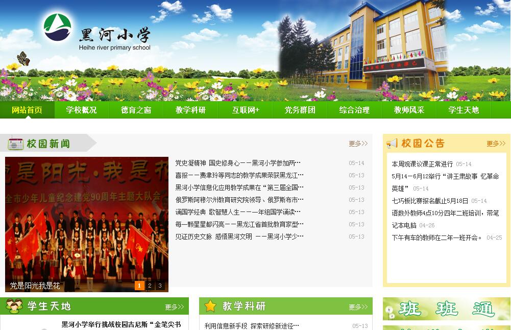 黑河小學(xué)創(chuàng)建于2007年9月,現(xiàn)有教職工74人。學(xué)校實(shí)施小班化教學(xué),班額在25-36人之間。以“全納、適宜、精致、優(yōu)質(zhì)”為價(jià)值追求,秉承“每一顆星星都閃亮”的辦學(xué)理念,實(shí)施“教育個性化、教育親情化、教育特長化”的辦學(xué)策略。小班化教育中實(shí)現(xiàn)對師生生命的高度關(guān)注,對學(xué)生的個別化教育,學(xué)校堅(jiān)持立德樹人,不斷加強(qiáng)校園文化建設(shè)、課程建設(shè)、隊(duì)伍建設(shè),實(shí)施多元評價(jià),開展課題研究,深化課堂教學(xué)改革,為學(xué)生的成長扎下終身發(fā)展的愿望之根、能力之根、品質(zhì)之根。作為黑河地區(qū)唯一一所教育部第一批信息化試點(diǎn)小學(xué),學(xué)校加大信息化建設(shè)投入力度建設(shè)高速互聯(lián)的校園網(wǎng),高效實(shí)用的“班班通”、高質(zhì)便捷的“人人通”,創(chuàng)建微課制作室、智動課堂、云課堂、專遞課堂、錄播教室、智高教室,實(shí)現(xiàn)虛擬化辦公,折射出了信息化助推學(xué)生個性發(fā)展的良好格局。建校八年來學(xué)校實(shí)現(xiàn)了跨越式發(fā)展:學(xué)校被授予國家教育部門首批信息化試點(diǎn)學(xué)校、國家語言文字規(guī)范化示范校、全國生態(tài)道德教育示范校、全國語文特色校、全國優(yōu)秀少先大隊(duì)、省首批義務(wù)教育標(biāo)準(zhǔn)化先進(jìn)學(xué)校、省行風(fēng)建設(shè)群眾最滿意學(xué)校等榮譽(yù)稱號。