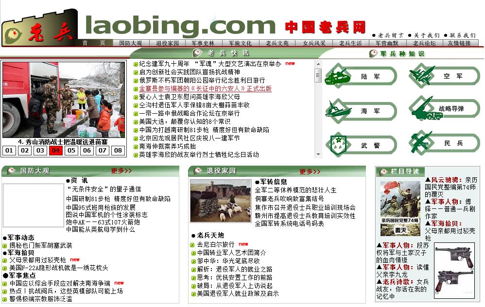 | 網(wǎng)站簡(jiǎn)介: “兵者,國(guó)之大事也”。國(guó)家的穩(wěn)定、繁榮、富強(qiáng),離不開(kāi)一支人民軍隊(duì)和一批曾為之奮斗的老兵。我們是老兵,我們無(wú)法忘懷那段肩負(fù)著光榮使命的甘苦歲月。為此,我們創(chuàng)立了“老兵網(wǎng)”。我們真誠(chéng)希望為老兵們做點(diǎn)實(shí)事,為他們創(chuàng)建一個(gè)溫馨的網(wǎng)絡(luò)社區(qū)。同時(shí),也希望廣大的軍事愛(ài)好者成為我們最好的朋友。 |