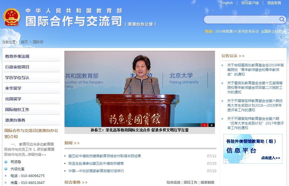 教育部國際合作與交流司的主要職責是:一、教育雙邊與多邊教育國際合作與交流工作:1.研究教育國際合作與交流的宏觀政策,擬訂發(fā)展規(guī)劃及相關(guān)法規(guī)性文件。2.擬訂教育合作與交流的國別及區(qū)域政策,為全國教育系統(tǒng)開展與其他國家或地區(qū)雙邊教育交流合作提供政策指導和信息服務(wù)。3.擬訂與國際組織(指除世界銀行、亞洲銀行和聯(lián)合國教科文組織以外的世界性和洲際政府間組織,下同)開展教育交流合作的政策、規(guī)劃。4.密切跟蹤世界各國教育發(fā)展和改革動態(tài),搜集和研究教育國際合作與交流工作中的重要情況,提出重大和敏感問題的解決方案和措施。5.推動與其他國家或地區(qū)國家教育部門和駐華外交機構(gòu)建立雙邊教育合作與交流的有效工作機制,參與政府間雙邊協(xié)調(diào)和磋商等。6.擬訂政府間雙邊教育合作與交流的協(xié)議和計劃,管理、協(xié)調(diào)政府間雙邊教育合作項目并監(jiān)督、評估執(zhí)行情況。7.組織開展與國際組織的合作與交流并負責指導、協(xié)調(diào)項目的實施。8.參與國家自貿(mào)協(xié)定的談判。統(tǒng)籌、協(xié)調(diào)教育部與國外跨國公司的教育交流與合作。9.爭取其他國家政府、區(qū)域性國際組織、機構(gòu)、團體、企業(yè)和個人對我國教育事業(yè)的資助和捐贈等。10.指導我駐各國使(領(lǐng))館教育處(組)的相關(guān)業(yè)務(wù)工作,加強溝通并提供信息支持服務(wù)。11.指導和協(xié)調(diào)駐外使(領(lǐng))館教育處(組)開展調(diào)研工作,負責調(diào)研成果的統(tǒng)籌和使用,編印《國外教育調(diào)研》,統(tǒng)計教育國際合作與交流的數(shù)據(jù)資料。12.審核和指導部屬事業(yè)單位境內(nèi)(外)舉辦教育展覽。13.負責在華舉行境外教育考試相關(guān)政策制訂和管理事宜。14.負責引進境外智力以及外籍教師、專家聘請和管理工作。15.擬訂教育部關(guān)于在華舉辦國際學術(shù)會議管理辦法的實施細則并審核相關(guān)事務(wù);審核部直屬單位和部屬高校舉辦雙邊國際學術(shù)會議;會同有關(guān)司局審核部機關(guān)、直屬單位人員及中管部屬高校正職校級領(lǐng)導出國參加國際會議的申請。16.統(tǒng)籌教育外事管理和擬訂因公出(來)訪團組的有關(guān)政策,負責編制教育部機關(guān)和直屬單位年度出(來)訪團組計劃,審核部機關(guān)、直屬單位人員及中管干部高校正職校級領(lǐng)導出訪國外任務(wù)。17.指導、協(xié)調(diào)部直屬單位與世界及亞洲大、中學生體育聯(lián)合會等國際學生體育組織的合作與交流。18.對部分具有外事審批權(quán)的部屬高校學者出國參加重要國際會議的申請進行審核。19.負責實施“資助部屬高校在華舉辦國際學術(shù)會議和學者出國參加國際學術(shù)會議經(jīng)費的項目”。20.擬訂部直屬單位和部屬高校以國家、單位或團體等名義加入國際學術(shù)組織的管理辦法或?qū)嵤┘殑t,并審核相關(guān)事務(wù)。21.會同部辦公廳審核部直屬單位和部屬高校擬在華成立國際學術(shù)組織的申請。22.承擔中美、中俄、中歐、中英等中外人文交流機制(合作委員會)中方秘書處辦公室職責,會同有關(guān)部門及時匯總上報機制(委員會)分支機構(gòu)合作情況,協(xié)調(diào)、督促機制(委員會)雙方主席達成的協(xié)議的落實和執(zhí)行。23.負責上海合作組織框架內(nèi)的教育合作事務(wù),保障教育部長會議機制和教育專家工作組會議機制的正常進行。二、來華和出國留學工作:24.指導并統(tǒng)籌管理全國來華、出國留學工作。擬訂來華、出國留學工作的政策及規(guī)劃。25.指導各省級教育行政部門制訂本地區(qū)來華留學工作發(fā)展規(guī)劃。26.擬訂中國政府獎學金招生計劃及招生、錄取、教學、管理等辦法,擬訂中國政府獎學金經(jīng)費預算方案、人均綜合撥款標準和開支辦法。27.負責來華留學教學及管理人員能力建設(shè)。28.監(jiān)督來華留學工作中的違規(guī)事件。29.負責統(tǒng)計、發(fā)布來華和出國留學工作各項數(shù)據(jù)。30.組織、協(xié)調(diào)和指導留華畢業(yè)生工作。31.協(xié)調(diào)相關(guān)司局負責外國留學生的學籍電子注冊和學歷證書電子注冊。32.審核國家公派出國留學年度計劃和項目立項報告,負責組織國家公派出國留學效益評估工作。33.負責組織旨在鼓勵留學人員回國工作和為國服務(wù)的重大活動,組織實施“留學回國人員科研啟動基金”和“春暉計劃”等項目。34.負責完善及更新“海外高層次留學人才信息數(shù)據(jù)庫”和“國內(nèi)高校引進優(yōu)秀留學人才需求信息庫”。35.會同做好在外高層次留學人才引進工作。36.會同指導在外留學人員服務(wù)、管理及安全教育等工作。37.研究出國留學人員黨務(wù)工作。三、涉外辦學工作:38.負責在華舉辦的中外合作辦學活動和我教育機構(gòu)赴境外辦學的相關(guān)政策研究和宏觀管理。39.受理本科及以上中外合作辦學項目和機構(gòu)的申請,組織專家評審、審核等,依法做出行政許可決定。40.負責對本科以下中外合作辦學項目和機構(gòu)的審核備案工作。41.負責對中外合作辦學活動監(jiān)管和質(zhì)量保障體系建設(shè),負責組織開展中外合作辦學評估工作,監(jiān)督