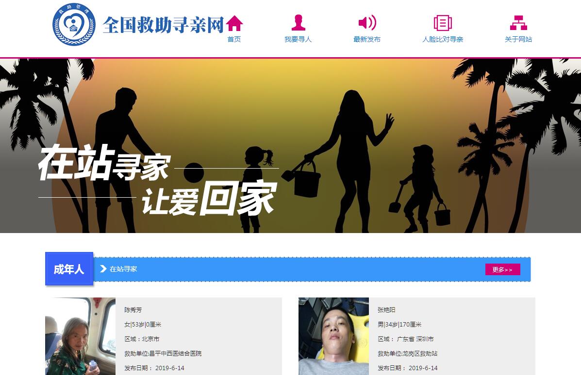 | 網(wǎng)站簡介: 全國救助尋親網(wǎng)(http://xunqin.mca.gov.cn),主要是方便各地救助管理機構(gòu)發(fā)布受助人員尋親公告,便于尋親家庭查找家人,協(xié)助走失人員早日返回家庭。民政部負責全國救助尋親網(wǎng)服務器的運行和維護。各地救助管理機構(gòu)是尋親公告的發(fā)布主體,對本機構(gòu)尋親公告的發(fā)布、管理及內(nèi)容的真實性、準確性負責。本網(wǎng)站是發(fā)布尋親公告的公益尋親平臺,尋親公告均由各地救助管理機構(gòu)主動上傳,本網(wǎng)站對尋親公告內(nèi)容不承擔法律責任。鑒于公告對象因故無法提供或不能準確提供身份信息,其尋親公告內(nèi)容可能存在缺失或錯誤,導致組合查詢結(jié)果可能出現(xiàn)誤差,因此建議您盡可能地翻閱本網(wǎng)站所有尋親公告。如果您在本網(wǎng)站發(fā)現(xiàn)有所尋人員線索的,可直接與發(fā)布公告的救助管理機構(gòu)聯(lián)系確認。本網(wǎng)站不向用戶收取任何費用。 |