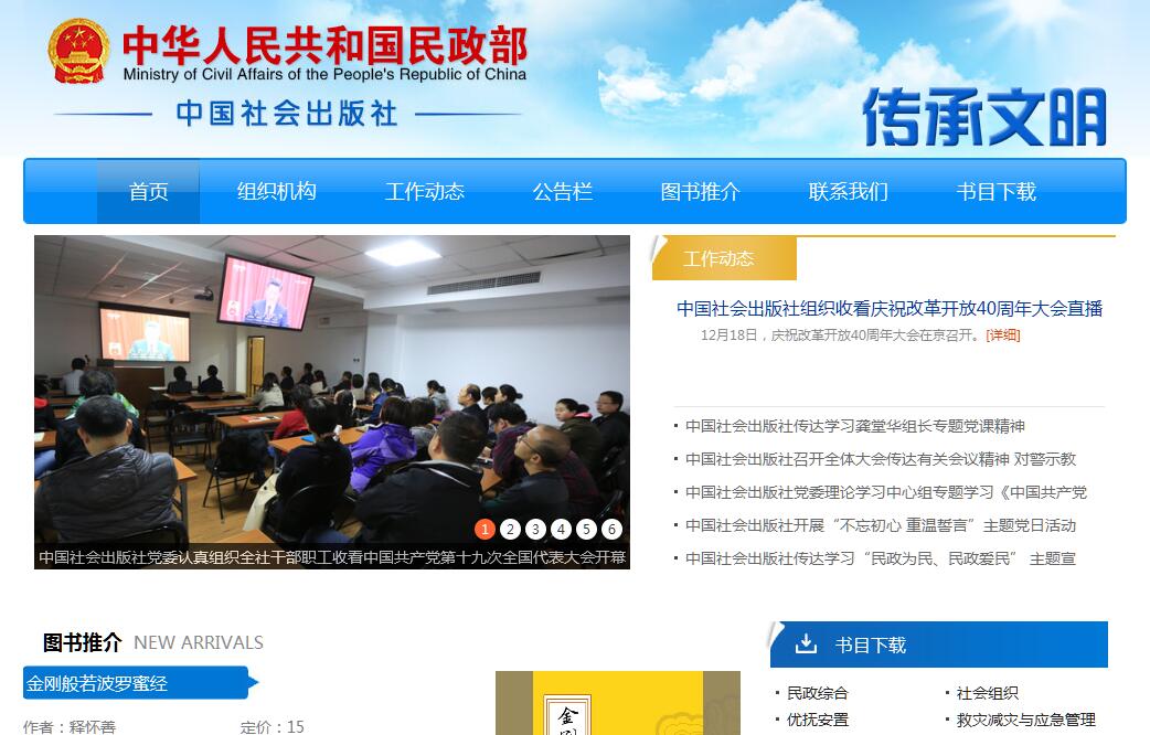 中國社會出版社成立于1989年7月,為民政部主管、財政部代表國務(wù)院履行出資人職責的國有獨資中央文化企業(yè),國家一級出版社、全國百佳圖書出版單位。出版物以社會建設(shè)領(lǐng)域的圖書為主體,以城鄉(xiāng)社區(qū)居民讀物、老年讀物和民俗類圖書為重點,涉及基層政權(quán)和社區(qū)建設(shè)、社會工作、社會組織、社會救助、社會福利(包括福利彩票、慈善事業(yè)、社會捐助、老年人和殘疾人福利、兒童福利和兒童收養(yǎng))、社會事務(wù)(包括婚姻、殯葬、生活無著人員救助)、老齡事業(yè)、減災(zāi)救災(zāi)、優(yōu)撫安置、行政區(qū)劃和地名、邊界管理、難民安置、新農(nóng)村建設(shè)等業(yè)務(wù)范疇和社會、經(jīng)濟、政治、法律、文化、歷史、文學(xué)、教育、農(nóng)業(yè)、倫理、哲學(xué)等學(xué)科領(lǐng)域。年均出版各類新書500種左右,重版率在50%以上,在銷圖書4000多種,多種圖書在國際、國內(nèi)獲獎。中國社會出版社現(xiàn)有員工90人,其中具有中級以上專業(yè)技術(shù)職務(wù)的專業(yè)人才50多人,1人入選全國新聞出版行業(yè)領(lǐng)軍人才。從2003年開始,中國社會出版社參與了由民政部、中央文明辦、新聞出版總署、國家廣電總局發(fā)起主辦(2007年文化部、中國作家協(xié)會加入)的“萬家社區(qū)圖書室援建和萬家社區(qū)讀書活動”,承擔圖書室援建任務(wù)。截至2015年底,共援建城鄉(xiāng)社區(qū)圖書室18.5萬家,援建圖書6850余萬冊,使4億多城鄉(xiāng)居民從中受益,成為農(nóng)村文化建設(shè)的一個知名品牌,受到城鄉(xiāng)居民的廣泛好評,被社會各界譽為一項得民心、聚民心、暖民心的民心工程,中央領(lǐng)導(dǎo)劉云山、回良玉曾作出重要批示,給予充分肯定。