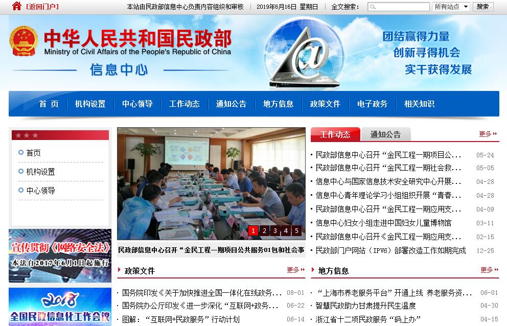 民政部信息中心是民政部直屬事業(yè)單位,受民政部委托承擔民政信息化建設(shè)的主要任務(wù),是民政部信息化建設(shè)的主要組織和實施部門。它的主要職能和任務(wù)是:1.制定民政系統(tǒng)信息化發(fā)展規(guī)劃并組織實施;制定民政系統(tǒng)信息化建設(shè)的管理制度、網(wǎng)絡(luò)建設(shè)及軟件開發(fā)的標準和規(guī)范。2.負責統(tǒng)一建設(shè)、管理、運行、維護部機關(guān)局域網(wǎng);負責民政部與各省市間信息網(wǎng)絡(luò)總體建設(shè)和管理工作;指導(dǎo)省級民政部門的信息化建設(shè)工作。3.負責建設(shè)民政部網(wǎng)站,宣傳民政事業(yè),促進政務(wù)公開,提供信息服務(wù);指導(dǎo)省級民政部門及部直屬單位的網(wǎng)站建設(shè)工作。4.負責總體協(xié)調(diào)民政業(yè)務(wù)軟件的研制、推廣和應(yīng)用工作。5.應(yīng)用計算機及網(wǎng)絡(luò)通訊技術(shù),處理各類民政業(yè)務(wù)信息。負責信息的采集、分析、編輯、傳輸、發(fā)布、儲存,為各級領(lǐng)導(dǎo)及業(yè)務(wù)司局提供信息服務(wù)。6.負責部機關(guān)辦公自動化設(shè)備的維修及更新改造。7.承辦部、廳領(lǐng)導(dǎo)交辦的其他事項。