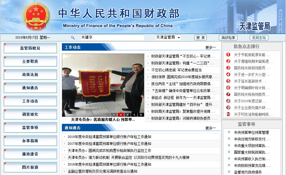 財(cái)政部天津監(jiān)管局主要職責(zé):一、貫徹落實(shí)黨中央關(guān)于財(cái)經(jīng)工作的方針政策和決策部署,在履行職責(zé)過程中堅(jiān)持和加強(qiáng)黨對財(cái)政工作的集中統(tǒng)一領(lǐng)導(dǎo),履行全面從嚴(yán)治黨責(zé)任。二、調(diào)查研究屬地經(jīng)濟(jì)發(fā)展形勢和財(cái)政運(yùn)行狀況。根據(jù)財(cái)政部授權(quán)管理屬地中央各項(xiàng)財(cái)政收支,承擔(dān)財(cái)稅法規(guī)和政策在屬地的執(zhí)行情況、預(yù)算管理有關(guān)監(jiān)督工作,向財(cái)政部提出相關(guān)政策建議。三、對屬地中央預(yù)算單位預(yù)決算編制情況進(jìn)行評估并向財(cái)政部提出審核意見。根據(jù)財(cái)政部授權(quán)對屬地中央預(yù)算單位預(yù)算執(zhí)行情況進(jìn)行監(jiān)控及分析預(yù)測。組織對中央重大財(cái)稅政策和專項(xiàng)轉(zhuǎn)移支付在屬地的執(zhí)行情況進(jìn)行績效評價,提出相關(guān)改進(jìn)措施建議并跟蹤落實(shí)。四、根據(jù)財(cái)政部授權(quán)對地方政府債務(wù)實(shí)施監(jiān)控,嚴(yán)控法定限額內(nèi)債務(wù)風(fēng)險,防控隱性債務(wù)風(fēng)險,發(fā)現(xiàn)風(fēng)險隱患及時提出改進(jìn)和處理意見并向財(cái)政部、地方人民政府反映報(bào)告。五、按規(guī)定權(quán)限審核審批屬地中央行政事業(yè)單位國有資產(chǎn)配置、處置等事項(xiàng)。根據(jù)財(cái)政部授權(quán)監(jiān)管屬地中央金融企業(yè)執(zhí)行財(cái)務(wù)制度等情況。六、根據(jù)財(cái)政部統(tǒng)一部署,承擔(dān)有關(guān)會計(jì)信息質(zhì)量、注冊會計(jì)師行業(yè)執(zhí)業(yè)質(zhì)量、資產(chǎn)評估行業(yè)執(zhí)業(yè)質(zhì)量監(jiān)督檢查工作,參與跨境會計(jì)監(jiān)管合作。七、完成財(cái)政部交辦的其他任務(wù)。