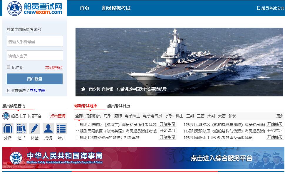 船員考試網(wǎng)(www.crewexam.com)是中國船員考試網(wǎng)船員服務(wù)中心根據(jù)海事局最新船員考試V7.0系統(tǒng)模式,與國內(nèi)船員培訓機構(gòu)聯(lián)合打造的船員在線模擬考試系統(tǒng)。根據(jù)最新《中華人民共和國海船船員適任考試和發(fā)證規(guī)則》(簡稱11規(guī)則)相關(guān)規(guī)定,自2012年下半年起海事局船員考試啟用新版考試大綱。為幫助廣大船員朋友熟悉船員考試規(guī)則,適應(yīng)船員證書電腦考試環(huán)境,熟練掌握培船員適認證培訓知識點和業(yè)務(wù)要領(lǐng),滿足船員培訓機構(gòu)和大中專航海院校多元化電子培訓,船員考試網(wǎng)平臺與國內(nèi)船員培訓機構(gòu)、航海院校合作,結(jié)合船員培訓考試的實際需求,開發(fā)出具有獨立知識產(chǎn)權(quán)的船員模擬考試系統(tǒng)。船員考試網(wǎng)以真誠、務(wù)實的態(tài)度,認真學習和貫徹《中華人民共和國海船船員適任考試和發(fā)證規(guī)則》(簡稱11規(guī)則)的相關(guān)規(guī)定,組織各區(qū)域海事相關(guān)的船員培訓機構(gòu)和航海院校的師資力量,結(jié)合航海類實際教學要求,征集符合11規(guī)則要求的航海類各科目試題,為國家海事局船員服務(wù)中心提供船員考試題庫建設(shè)服務(wù)。船員考試網(wǎng)提供網(wǎng)頁版模擬考試系統(tǒng),同時提供手機版《船員考試寶典》,為廣大船員朋友隨時隨地提供最新的船員培訓考試日歷和在線模擬考試和練習系統(tǒng),提高船員培訓考試的通過率,讓船員考試更簡單!