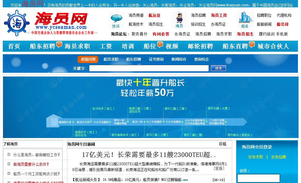 "海員網(wǎng)"于2009年6月25日正式上線“海員網(wǎng)”是服務(wù)中國海員的綜合性網(wǎng)站,同時是面向中國廣大海員的門戶型網(wǎng)站,集海員招生,海員咨詢,海事信息,航海資料下載等功能為一體,是中國海事行業(yè)、船員勞務(wù)、海員與海員之間、海事院校與海事專業(yè)老師及海事專業(yè)學生的公正、高效、實用的信息平臺。"海員網(wǎng)"自建站以來,不斷改革創(chuàng)新,吸取了大量寶貴的經(jīng)驗和教訓,立志做中國最好的海員招生信息網(wǎng)。"海員網(wǎng)"將努力整合行業(yè)各方面的資源,以配合海事院校、航運公司、以及船員等工作人員等行業(yè)資源的優(yōu)化配置;為院校資源充分利用,培養(yǎng)出更多更好更實用的優(yōu)質(zhì)船員;公司有更多的合格船員可以得心應(yīng)手的使用派遣;以及有更多的船員和其他航運業(yè)的工作人員能夠有更好更高的施展才華的平臺!同時希望能夠成為海事行業(yè)的政府當局、海事企業(yè)、從業(yè)人員等相互溝通的信息平臺。"海員網(wǎng)”采用高級海員培訓一站式管理(與航運公司或海事院校簽定就業(yè)協(xié)議,海事學校高級海員招生簡章)采用海員招生、培訓、就業(yè)一站服務(wù),搭建學生-海事院校-船東公司之間橋梁,為推進航海教育事業(yè)的發(fā)展貢獻力量!