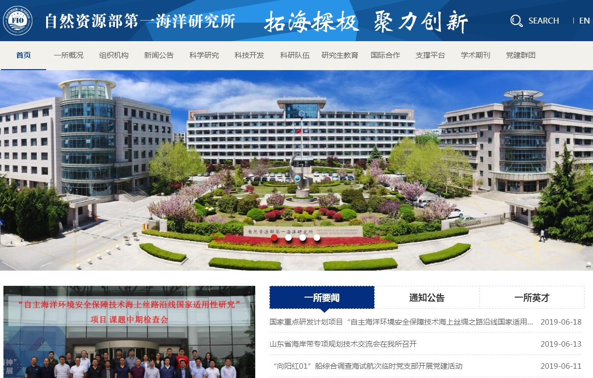 自然資源部第一海洋研究所(簡稱海洋一所),現隸屬于自然資源部,始建于1958年,為海軍第四海洋研究所,1964年整建制劃歸原國家海洋局,更名為國家海洋局第一海洋研究所,2018年并入自然資源部,更名為自然資源部第一海洋研究所,是從事基礎研究、應用基礎研究和社會公益服務的綜合性海洋研究所,共占地170余畝,擁有嶗山所區(qū)和鰲山所區(qū)(在建)。研究所以促進海洋科技進步,為海洋資源環(huán)境管理和海洋經濟發(fā)展服務為宗旨,是國家科技創(chuàng)新體系的重要海洋科研實體。主要研究領域為中國近海、大洋和極地海域自然環(huán)境要素分布及變化規(guī)律,包括海洋資源與環(huán)境地質;海洋災害發(fā)生機理及預測方法;海氣相互作用與氣候變化;海洋生態(tài)環(huán)境變化規(guī)律和海島海岸帶保護與綜合利用等。建所60余年來,自然資源部第一海洋研究所已發(fā)展成為國內外知名的海洋科研機構,已擁有近600人的科學研究、技術支撐和業(yè)務管理隊伍,其中高級職稱180余人;設有8個主要學科領域,涉及海洋科學32個研究方向;牽頭組建了青島海洋科學與技術國家實驗室的2個功能實驗室,建有5個部級重點實驗室、9個國際科技合作機構;擁有2艘國際領先的大洋級海洋科學綜合考察船及國際一流水平的海洋調查測量設備、實驗測試設備和科研輔助設施;參與并完成了一大批國家重大海洋專項、973項目、863計劃項目、國家科技支撐項目、國家自然科學基金項目、國際合作項目和海洋開發(fā)項目,獲省部級及以上科技獎勵250余項,其中主持完成100余項;制定推薦性國家標準10項;獲得國家發(fā)明專利授權168項,獲得國際專利授權7項,為我國海洋科學事業(yè)的發(fā)展和海洋經濟建設做出了突出的貢獻。