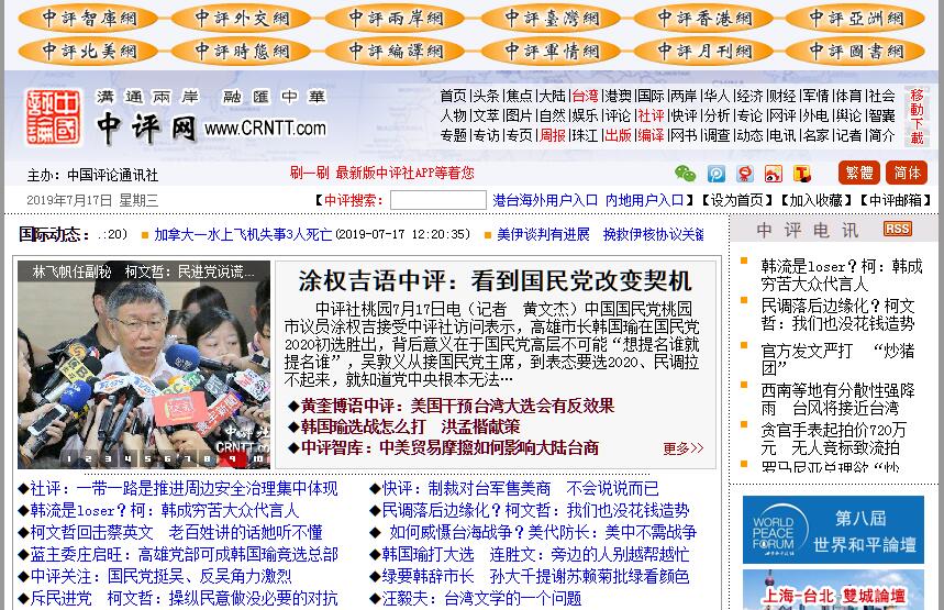 | 網(wǎng)站簡(jiǎn)介: 中國(guó)評(píng)論通訊社(中評(píng)社)是大中華地區(qū)第一家數(shù)字化網(wǎng)絡(luò)通訊社,目前已在臺(tái)北市、新北市、桃園縣、臺(tái)中市、臺(tái)南市、高雄市,以及香港、北京、廣州、美國(guó)華盛頓特區(qū)、洛杉磯、韓國(guó)首爾等地建立起比較完整的新聞采編體系,于2005年6月3日通過(guò)中國(guó)評(píng)論新聞網(wǎng)(中評(píng)網(wǎng))正式對(duì)外發(fā)稿。中評(píng)社與中國(guó)評(píng)論月刊、中國(guó)評(píng)論學(xué)術(shù)出版社等機(jī)構(gòu)緊密合作,此外,通過(guò)中評(píng)智庫(kù)基金會(huì)與兩岸及港澳、北美、東亞的200多家戰(zhàn)略和政策研究機(jī)構(gòu)、以及2000多名專家學(xué)者開(kāi)展互動(dòng)。中評(píng)網(wǎng)(www.CRNTT.com)分別在香港和北京設(shè)置了兩組鏡像網(wǎng)站,同步對(duì)外發(fā)布新聞信息。中評(píng)社(網(wǎng))實(shí)行二十四小時(shí)滾動(dòng)播發(fā)新聞信息,有關(guān)新聞及言論從點(diǎn)、線、面多維度為兩岸受眾提供不一樣的視角與思維,在兩岸關(guān)系與新聞傳播方面,中評(píng)社(網(wǎng))具有領(lǐng)導(dǎo)、塑造、影響話語(yǔ)權(quán)的作用。 |