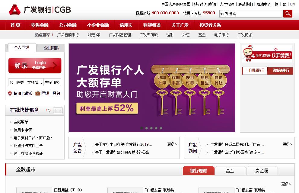 廣發(fā)銀行成立于1988年,是國內(nèi)首批組建的股份制商業(yè)銀行之一。本行秉持“誠信、責任、創(chuàng)新、篤行”的核心價值觀,牢記“服務(wù)客戶、回報股東、成就員工、奉獻社會”的歷史使命,踐行“相知相伴、全心為您”的服務(wù)理念,朝著實現(xiàn)“全國一流商業(yè)銀行”的戰(zhàn)略目標奮勇前進。本行致力于為客戶提供高質(zhì)量、高效率、全方位的綜合金融服務(wù)。在北京、天津、河北、山西、遼寧、吉林、黑龍江、上海、江蘇、浙江、安徽、福建、江西、山東、河南、湖北、湖南、廣東、廣西、重慶、四川、云南、陜西、新疆等境內(nèi)24個?。ㄖ陛犑?、自治區(qū))100個地級及以上城市和澳門特別行政區(qū)設(shè)立了44家直屬分行、862家營業(yè)機構(gòu),并與全球100多個國家和地區(qū)的1,319家金融機構(gòu)建立了SWIFT密押關(guān)系,為30多萬對公客戶、3,700多萬個人客戶、4,600多萬信用卡客戶和3,600多萬移動金融客戶提供優(yōu)質(zhì)、全面的金融服務(wù)。