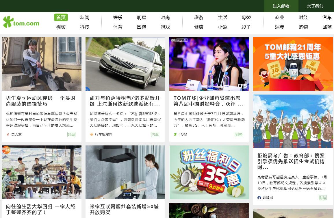 | 網(wǎng)站簡介: TOM網(wǎng)(www.tom.com)是一款輕奢即時資訊平臺,它為用戶推薦最新的娛樂資訊、時尚前瞻的搭配指南,是國內(nèi)了解娛樂、時尚資訊最便捷的途徑之一,內(nèi)容涵蓋娛樂時尚、體壇賽事、要聞事件、汽車科技、母嬰消費、購物生活、健康旅游、游戲郵箱、段子的頻道信息。 |