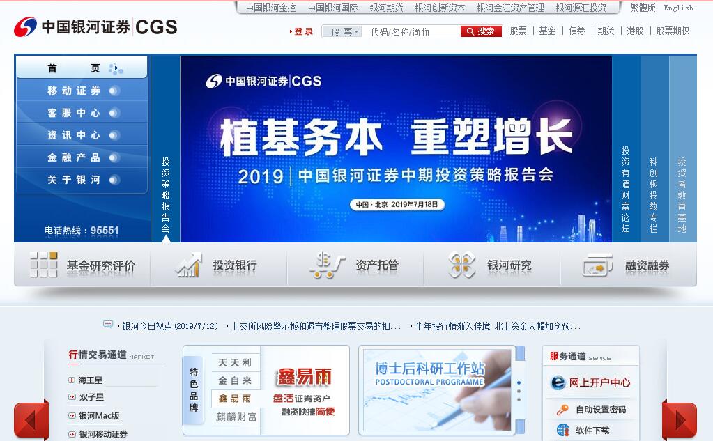 中國銀河證券股份有限公司(以下簡(jiǎn)稱“公司”),是中國證券行業(yè)領(lǐng)先的綜合性金融服務(wù)提供商。公司借助獨(dú)特的歷史、品牌和股東優(yōu)勢(shì),行業(yè)內(nèi)覆蓋最廣的營(yíng)業(yè)網(wǎng)點(diǎn)和規(guī)模領(lǐng)先的客戶群,以及綜合全面的業(yè)務(wù)實(shí)力,為政府、企業(yè)、機(jī)構(gòu)和個(gè)人提供智庫咨詢、財(cái)富管理、投融資、國際業(yè)務(wù)等綜合金融服務(wù)。公司的目標(biāo)是成為亞洲資本市場(chǎng)上領(lǐng)先的投資銀行和具有系統(tǒng)重要性的證券業(yè)金融機(jī)構(gòu)。2007年1月26日,經(jīng)中國證監(jiān)會(huì)批準(zhǔn),由中國銀河金融控股有限責(zé)任公司作為主發(fā)起人,聯(lián)合4家國內(nèi)機(jī)構(gòu)投資者,共同發(fā)起設(shè)立中國銀河證券股份有限公司,收購原中國銀河證券有限責(zé)任公司(2000年8月成立,性質(zhì)為國有獨(dú)資證券公司)相關(guān)業(yè)務(wù)及資產(chǎn)。公司總部設(shè)在北京,注冊(cè)資本為人民幣101.37億元。公司于2013年5月22日在香港聯(lián)合交易所H股上市,股票代碼06881.HK ,2017年1月23日在上海證券交易所A股上市,股票代碼601881.SH。中國銀河金融控股有限責(zé)任公司為控股股東,中央?yún)R金投資有限責(zé)任公司為實(shí)際控制人。公司以打造航母券商、建設(shè)現(xiàn)代投行為戰(zhàn)略目標(biāo),秉承創(chuàng)新、合規(guī)、服務(wù)、協(xié)同的企業(yè)價(jià)值觀,始終聚焦國家戰(zhàn)略實(shí)施,支持實(shí)體經(jīng)濟(jì)發(fā)展,服務(wù)居民財(cái)富管理,踐行企業(yè)社會(huì)責(zé)任,堅(jiān)持實(shí)現(xiàn)公司價(jià)值、股東回報(bào)、員工利益與社會(huì)責(zé)任的有機(jī)結(jié)合。截至2018年12月31日,公司共設(shè)有36家分公司、493家營(yíng)業(yè)部,分布在全國179個(gè)地級(jí)以上城市,海外業(yè)務(wù)網(wǎng)絡(luò)延伸至香港、新加坡、泰國、印度尼西亞、韓國、印度、馬來西亞、英國、美國等9個(gè)國家和地區(qū)。公司旗下?lián)碛秀y河期貨有限公司、銀河創(chuàng)新資本管理有限公司、中國銀河國際金融控股有限公司、銀河金匯證券資產(chǎn)管理有限公司、銀河源匯投資有限公司等5家子公司。