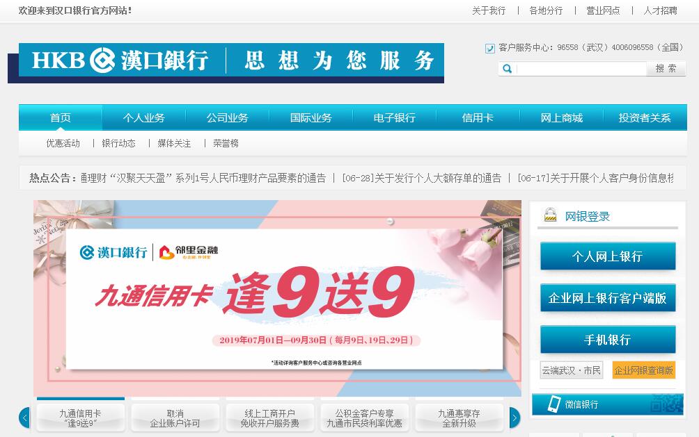 漢口銀行成立于1997年12月,是一家總部位于武漢的城市商業(yè)銀行?,F(xiàn)有各類分支機構(gòu)173家,機構(gòu)基本覆蓋湖北省,在重慶設(shè)有省外分行。漢口銀行以成為“特色鮮明、價值領(lǐng)先、可持續(xù)發(fā)展的現(xiàn)代金融企業(yè)”為戰(zhàn)略愿景,以“思想為您服務(wù)”為核心價值理念,近年來通過專業(yè)化經(jīng)營和精細化管理,著力在科技金融、民生金融、小微金融、互聯(lián)網(wǎng)金融等領(lǐng)域不斷培育和塑造經(jīng)營特色,可持續(xù)發(fā)展能力持續(xù)增強,走出了一條“規(guī)模+特色”的中小銀行發(fā)展道路。2016年,漢口銀行獲批投貸聯(lián)動業(yè)務(wù)試點資格,成為國內(nèi)首批10家試點銀行之一,推動科技金融品牌在全國產(chǎn)生了廣泛影響。自成立以來,漢口銀行市場影響力和品牌形象不斷提升。截至2018年末,全行表內(nèi)外資產(chǎn)總額超4000億元。根據(jù)英國《銀行家》雜志排名,漢口銀行從2010年起,一直躋身全球銀行500強。相繼獲評中國十大品牌中小銀行、全國銀行業(yè)金融機構(gòu)小企業(yè)金融服務(wù)先進單位、最佳科技金融服務(wù)銀行,最佳中小銀行——最具特色獎、最佳董事會獎、最佳品牌推廣獎等榮譽。