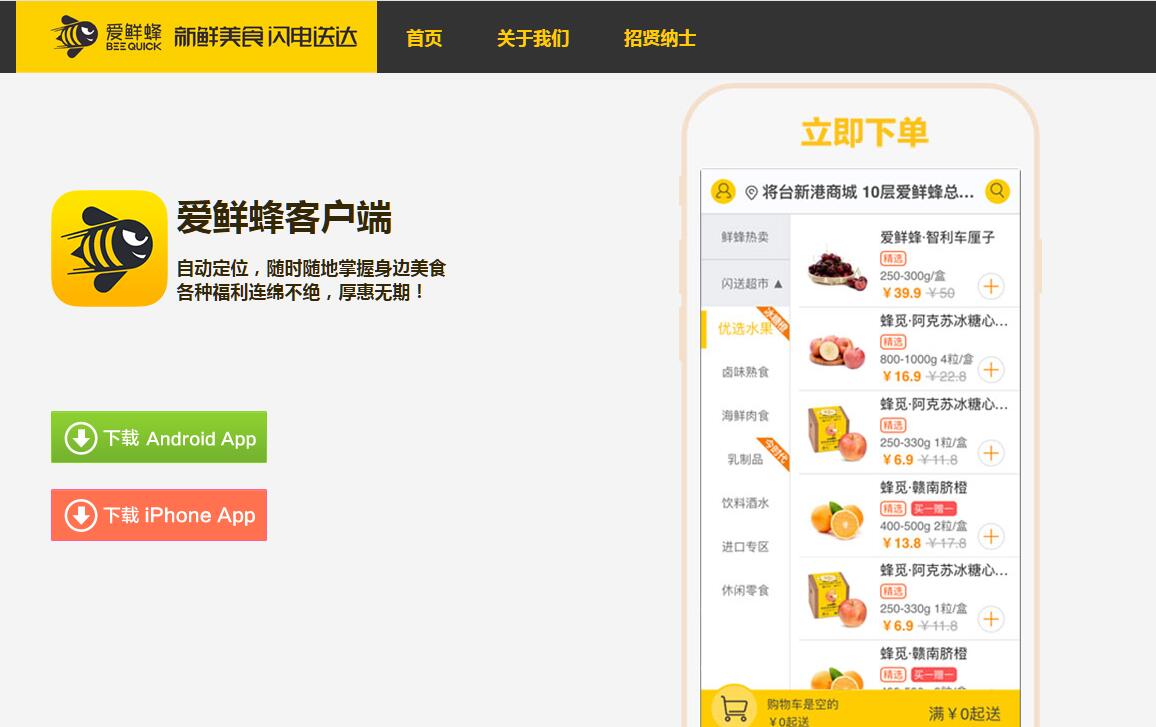 | 網(wǎng)站簡介: 愛鮮蜂于2014年5月上線,是以眾包微物流配送為核心模式,基于移動終端定位的技術(shù)解決方案提供O2O運營服務(wù)的公司。專注于社區(qū)生鮮最后一公里配送,主打30分鐘閃電送達。平臺強勢產(chǎn)品以生鮮為主,定位人群為年輕白領(lǐng)。哈根達斯、星巴克、國際高標準的酸奶,產(chǎn)地直采水果、南北極海鮮、麻小鹵味…你想要的,你需要的,各種新鮮,閃電送達。愛鮮蜂的“鮮”強調(diào)的就是食品的新鮮以及多樣性,而“蜂”則代表我們配送人員的數(shù)量多、速度快。 |