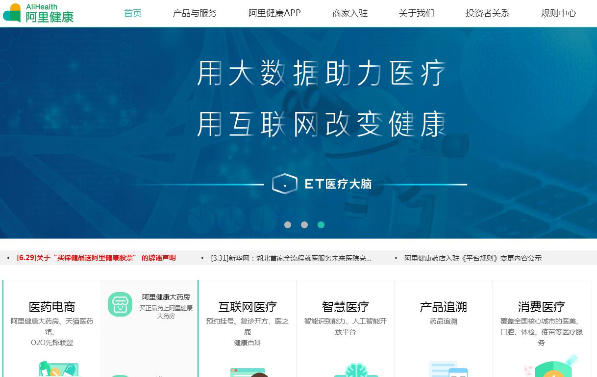 阿里健康(00241.HK)是阿里巴巴集團(tuán)“Double H”戰(zhàn)略(Health and Happiness 健康與快樂)在大健康領(lǐng)域的旗艦平臺(tái),是阿里巴巴集團(tuán)投資控股的公司之一。憑借阿里巴巴集團(tuán)在電子商務(wù)、互聯(lián)網(wǎng)金融、物流、大數(shù)據(jù)和云計(jì)算等領(lǐng)域的優(yōu)勢(shì),阿里健康以用戶為核心,全渠道推進(jìn)醫(yī)藥電商及新零售業(yè)務(wù),并為大健康行業(yè)提供線上線下一體化的全面解決方案,以期對(duì)現(xiàn)有社會(huì)醫(yī)藥健康資源實(shí)現(xiàn)跨區(qū)域的共享配置,同時(shí)在保障專業(yè)安全的基礎(chǔ)上,大幅提高患者就醫(yī)購(gòu)藥的便捷性,滿足消費(fèi)者對(duì)健康生活方式的追求。目前,阿里健康開展的業(yè)務(wù)主要集中在醫(yī)藥電商及新零售、互聯(lián)網(wǎng)醫(yī)療、消費(fèi)醫(yī)療、智慧醫(yī)療等領(lǐng)域。