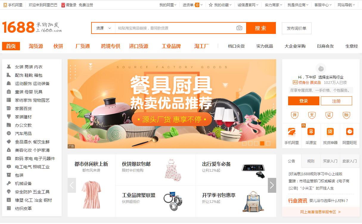 | 網(wǎng)站簡(jiǎn)介: 阿里巴巴(1688.com)批發(fā)網(wǎng)是全球企業(yè)間(B2B)電子商務(wù)的著名品牌,為數(shù)千萬(wàn)網(wǎng)商提供海量商機(jī)信息和便捷安全的在線交易市場(chǎng),也是商人們以商會(huì)友、真實(shí)互動(dòng)的社區(qū)平臺(tái)。目前1688.com已覆蓋原材料、工業(yè)品、服裝服飾、家居百貨、小商品等12個(gè)行業(yè)大類,提供從原料--生產(chǎn)--加工--現(xiàn)貨等一系列的供應(yīng)產(chǎn)品和服務(wù)。 |