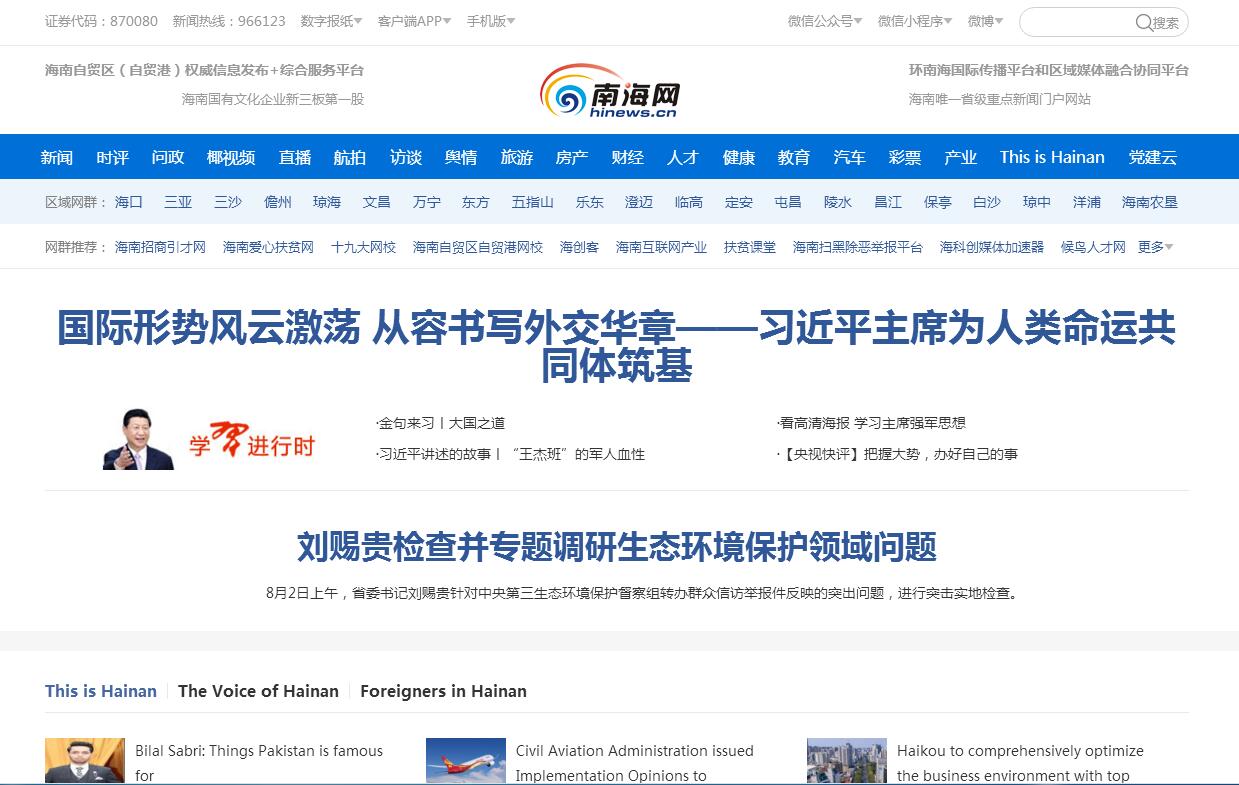 南海網(wǎng)(www.hinews.cn)創(chuàng)辦于1999年1月1日,是由中共海南省委宣傳部、中共海南省委網(wǎng)絡安全和信息化委員會辦公室主管,經(jīng)國務院新聞辦公室認定的海南省級重點新聞網(wǎng)站,是海南省委省政府認可的“一報一臺一網(wǎng)”海南三大主流媒體之一。南海網(wǎng)堅持“新聞立網(wǎng)、移動優(yōu)先”,以“快速、全面、權(quán)威、公信、價值”為新聞傳播宗旨。2018年4月,中央決定,支持海南全島建設自貿(mào)區(qū)和中國特色自貿(mào)港,南海網(wǎng)搶抓重大發(fā)展機遇,對網(wǎng)站定位進行了新一輪調(diào)整,致力于打造中國最大自貿(mào)區(qū)、自貿(mào)港權(quán)威信息發(fā)布+綜合服務平臺、環(huán)南海國際傳播平臺和區(qū)域媒體融合協(xié)同平臺。南海網(wǎng)于2019年1月1日正式進行了新一輪改版升級,增設了“this is hainan”外文頻道等重要版塊和內(nèi)容,成為國內(nèi)外網(wǎng)友獲得海南自貿(mào)區(qū)、自貿(mào)港權(quán)威資訊的主要渠道。南海網(wǎng)擁有海南規(guī)模最大的網(wǎng)站數(shù)字內(nèi)容采集加工團隊,擁有視頻、移動直播、航拍、動漫、H5、vlog、圖片、文字等全媒體傳播手段和平臺。南海網(wǎng)憑借海南主流媒體首支英文報道團隊,在全省媒體中率先搭建英文平臺及英文欄目矩陣,開設This is Hainan(這里是海南)、The Voice of Hainan(海南之聲)、The Voice of Free Trade Port(自貿(mào)港之聲)等平臺及欄目,已成為海南原創(chuàng)外文報道內(nèi)容的重要提供者,有力提升了南海網(wǎng)國際傳播能力和水平。南海網(wǎng)加快推動媒體融合發(fā)展,通過“兩微”(微信、微博)、“兩端”(南海網(wǎng)客戶端、海南頭條客戶端)、海南旅游頭條網(wǎng)站(海南旅游內(nèi)容及服務平臺)、南海網(wǎng)發(fā)起的海南微聯(lián)盟(集納海南上千家自媒體公號)等平臺和組織,實現(xiàn)了多層次、全覆蓋的新聞傳播力、影響力。2018年底,南海網(wǎng)微信粉絲75萬+,成為海南省內(nèi)新聞媒體中粉絲量排名第一的官方微信公眾號;南海網(wǎng)微博粉絲400萬+;南海網(wǎng)新聞客戶端粉絲量達35萬+。同時,南海網(wǎng)還承建運營了海南自貿(mào)區(qū)唯一的官方招商引才平臺--海招網(wǎng)、海南首個互聯(lián)網(wǎng)+愛心扶貧公益平臺--海南愛心扶貧網(wǎng)、學習強國海南學習平臺等多個海南省重點網(wǎng)上平臺。具備較強的多平臺整合傳播能力。2016年12月,南海網(wǎng)正式在全國中小企業(yè)股份轉(zhuǎn)讓系統(tǒng)(“新三板”)掛牌,股票代碼:870080,成為海南國有文化企業(yè)掛牌“新三板”第一股。去年,南海網(wǎng)成功進行了股權(quán)轉(zhuǎn)讓,引入了國有資本新股東,行業(yè)深耕和資源獲取能力進一步增強。目前,南海網(wǎng)市值已達3.5億元。掛牌“新三板”后,南海網(wǎng)積極謀劃多元化發(fā)展,已擁有2家控股子公司--海南南海網(wǎng)人力資源開發(fā)有限公司(主營人才招聘、獵聘、考務、勞務派遣、人員培訓等)、海南聚農(nóng)優(yōu)品網(wǎng)絡科技有限公司(主營電子商務、農(nóng)副產(chǎn)品銷售等),1家參股子公司--海南快報網(wǎng)絡科技有限公司(主要運營海南頭條APP項目),1家分公司--海南南海網(wǎng)傳媒股份有限公司三亞分公司(主要負責三亞及南部市縣相關(guān)業(yè)務、運營海南互聯(lián)網(wǎng)+文旅創(chuàng)業(yè)中心等)。此外,由南海網(wǎng)策劃運營的海南首家媒體驅(qū)動型創(chuàng)新創(chuàng)業(yè)孵化園區(qū)--海南互聯(lián)網(wǎng)+眾創(chuàng)中心(??冢┮驯徽J定為國家級眾創(chuàng)空間、海南省首批省級重點互聯(lián)網(wǎng)眾創(chuàng)空間、海南省首批省級重點科技型眾創(chuàng)空間、??谑惺着屑壷攸c互聯(lián)網(wǎng)眾創(chuàng)空間。正在籌建海南互聯(lián)網(wǎng)+西部文創(chuàng)中心。眾創(chuàng)空間服務業(yè)務正成為南海網(wǎng)新的業(yè)務增長點。2017年,中國互聯(lián)網(wǎng)信息中心發(fā)布的《中國互聯(lián)網(wǎng)發(fā)展狀況統(tǒng)計報告》中,南海網(wǎng)位列中國區(qū)域門戶網(wǎng)站排行榜第八位;南海網(wǎng)榮獲“2016-2017 年度中國新聞網(wǎng)站十大影響力品牌獎”;南海網(wǎng)獲評“海南互聯(lián)網(wǎng)十大領(lǐng)軍企業(yè)”,南海網(wǎng)總裁韓潮光獲評“海南互聯(lián)網(wǎng)十大風云人物”。2018年,南海網(wǎng)在微博·大觀2017年度媒體盛典上獲得“最佳直播先鋒”獎;南海網(wǎng)榮獲“海南希望工程25年最具愛心單位”獎;南海網(wǎng)榮獲“金長城傳媒獎——2017中國年度影響力傳媒網(wǎng)站”;南海網(wǎng)在“2018網(wǎng)站信息生態(tài)指數(shù)”全國地方新聞網(wǎng)站月度排行榜中,7次進入前10名,最高排名全國第2。2019年,在中央網(wǎng)信辦指導的“因愛同行”2018網(wǎng)絡年度公益活動中,南海網(wǎng)建設和運維的海南愛心扶貧網(wǎng)榮獲2018網(wǎng)絡公益年度項目大獎。