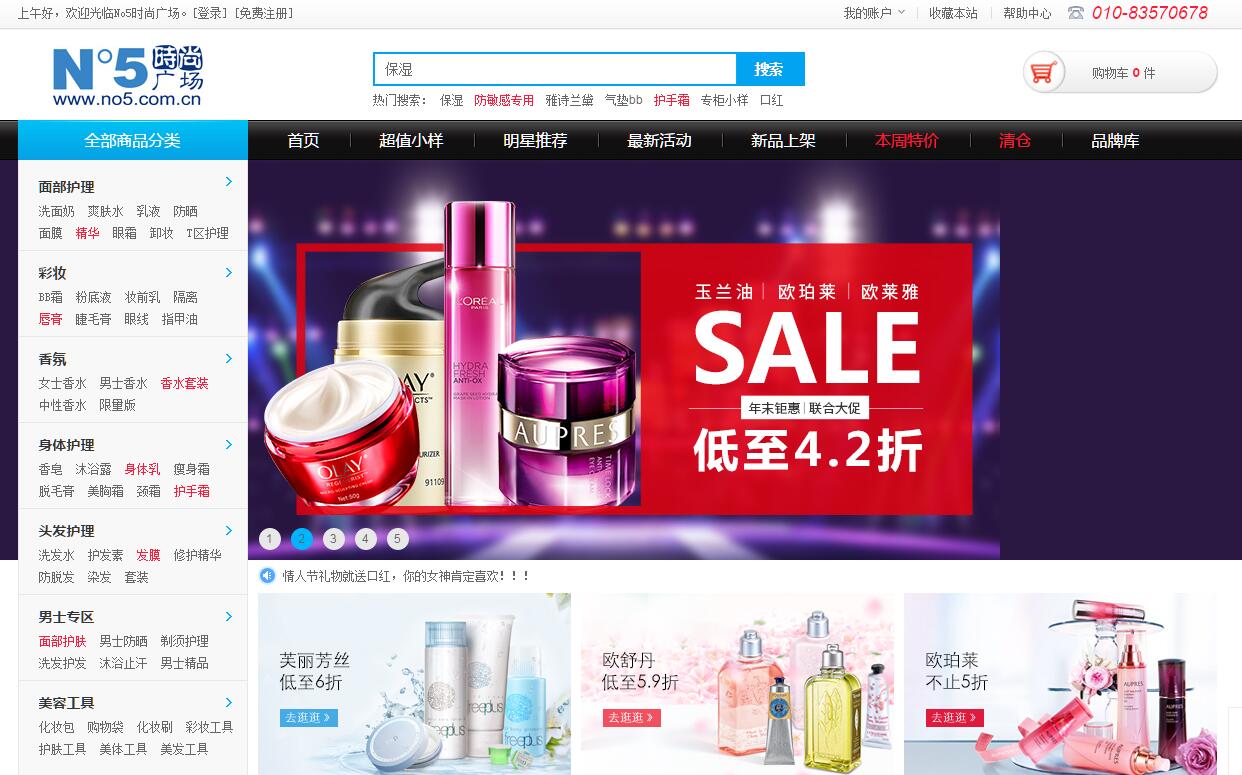 | 網(wǎng)站簡介: N°5時(shí)尚廣場(http://www.no5.com.cn)成立于2000年,隸屬于北京思學(xué)普信息技術(shù)有限公司。公司主要經(jīng)營護(hù)膚、香水、彩妝等女性用品的網(wǎng)上銷售。設(shè)有規(guī)模化的運(yùn)營和客服、物流中心,現(xiàn)經(jīng)營品牌200多個(gè),5000多種商品在線銷售。我們一直以誠信經(jīng)營為理念,以用戶至上為宗旨,向消費(fèi)者提供高品質(zhì)的產(chǎn)品,方便、靈活的訂購方式及支付系統(tǒng),并已在全國開通1875個(gè)城市、直轄市的快遞貨到付款服務(wù)。成立以來,憑借優(yōu)惠的價(jià)格及高效、優(yōu)質(zhì)的售后服務(wù),銷售額連年遞增,贏得了廣大消費(fèi)者的信任與支持,在電子商務(wù)領(lǐng)域樹立了品牌,并已處于領(lǐng)先地位。誠邀您加入N°5,享受尊貴的購物禮遇與豐富的優(yōu)惠促銷! |