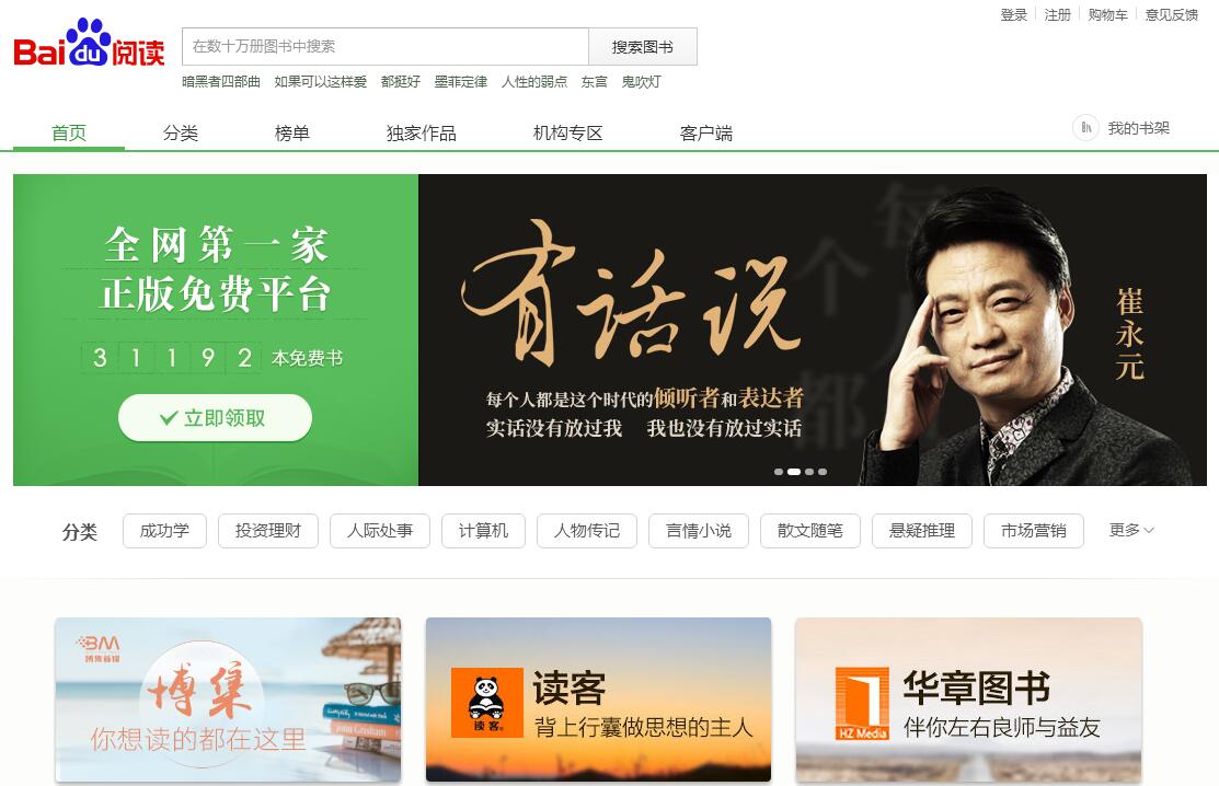 | 網(wǎng)站簡介: 百度閱讀提供豐富的電子圖書、暢銷書排行榜,種類包括小說、文學(xué)、傳記、藝術(shù)、少兒、經(jīng)濟(jì)、管理、生活等電子書的網(wǎng)上銷售,為您提供最佳的閱讀體驗(yàn)。 |