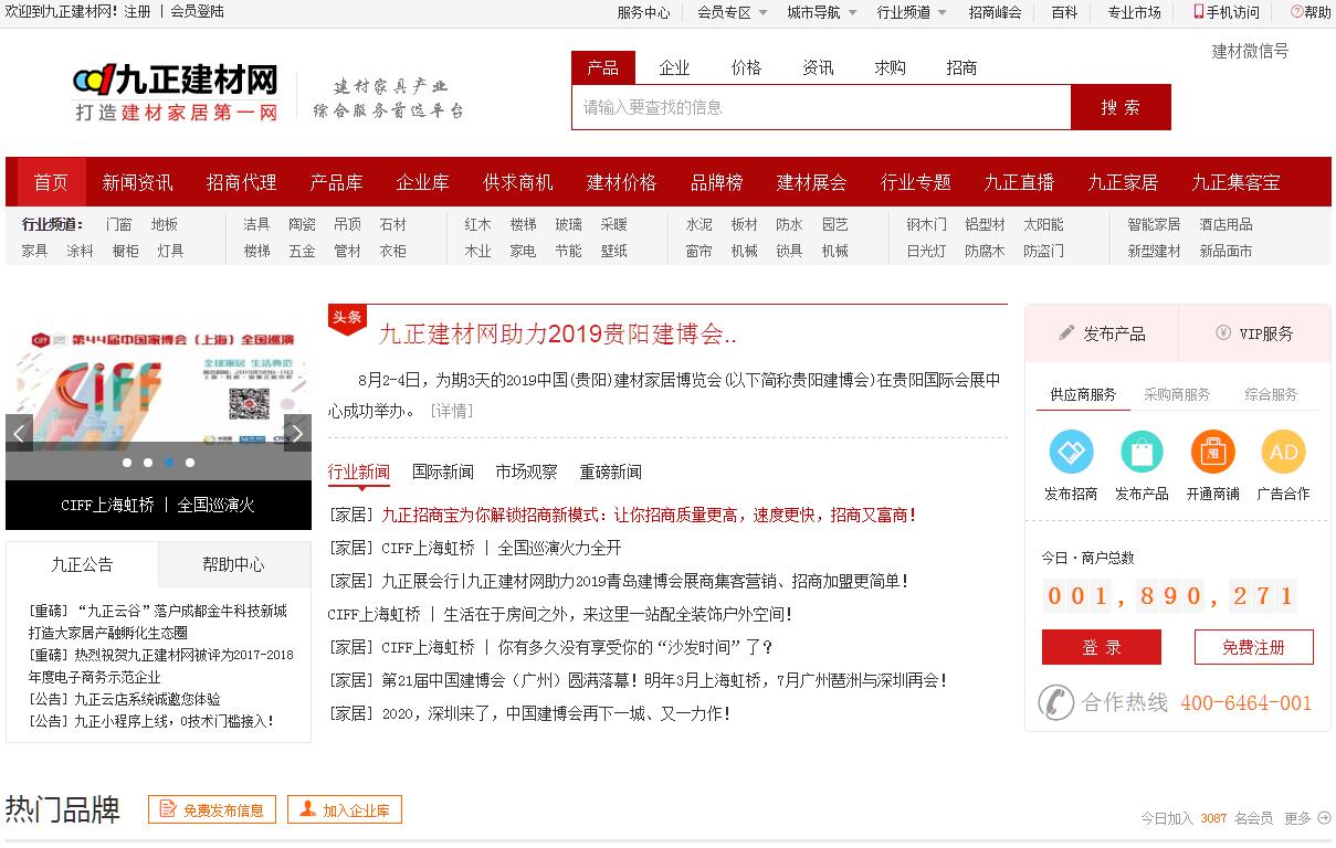 | 網(wǎng)站簡介: 九正建材網(wǎng)是建材行業(yè)門戶網(wǎng)站、行業(yè)電子商務網(wǎng)站50強,提供專業(yè)建材行業(yè)資訊、建材商機、建材招商、建材企業(yè)及產(chǎn)品,是建材企業(yè)網(wǎng)絡營銷的平臺。九正科技是一家集團化的公司,十八年專注于建材家居行業(yè),致力于用先進的互聯(lián)網(wǎng)技術、VR/AR場景技術、軟硬件技術給傳統(tǒng)工廠、賣場、經(jīng)銷商賦能,提供一攬子新零售解決案,讓天下沒有難做的建材生意!主推的九正家居智慧云店幫傳統(tǒng)建材家居廠商、門店、賣場提供變革的核動力,提供銷售的放大器。 |
