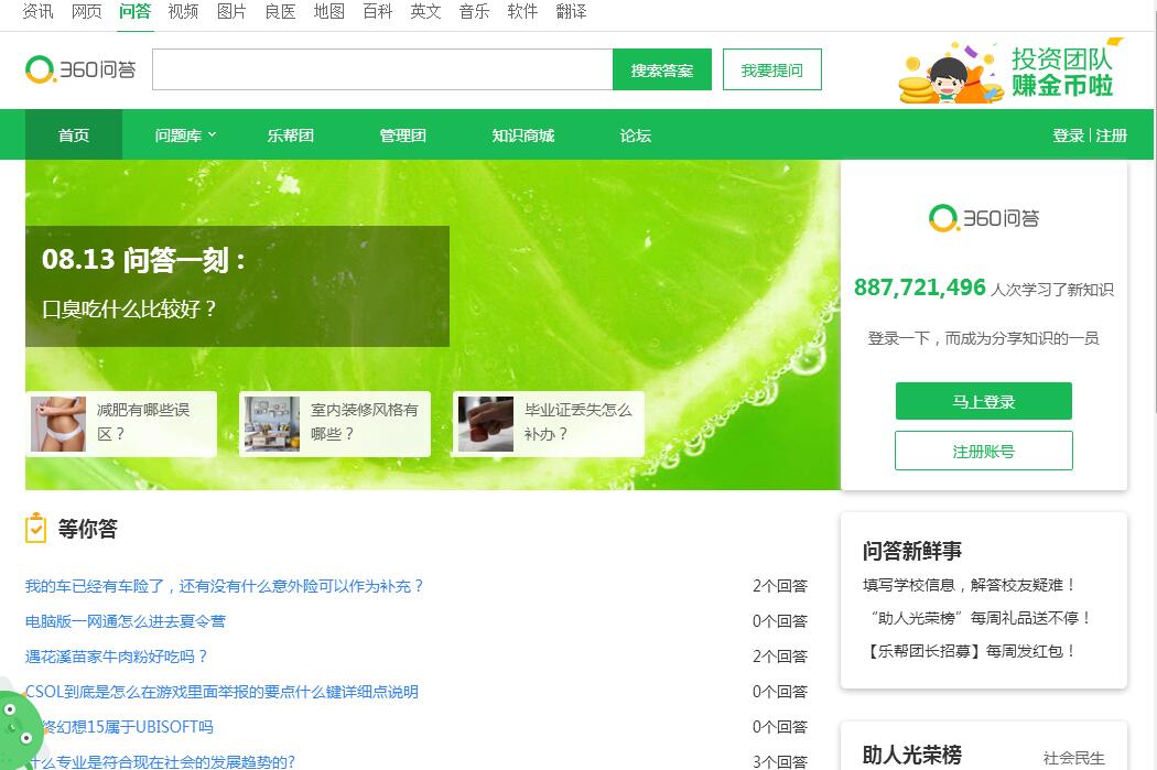 | 網(wǎng)站簡(jiǎn)介: 微知識(shí),大幫助——360問(wèn)答是一個(gè)互動(dòng)知識(shí)分享社區(qū),網(wǎng)友們可以把自己工作、生活中遇到的問(wèn)題提交給360問(wèn)答,360問(wèn)答會(huì)匹配到最適合的回答者來(lái)解答問(wèn)題。解決后的問(wèn)題可以被使用360搜索的其他用戶搜索到,幫助更多人解決類(lèi)似的問(wèn)題。 |