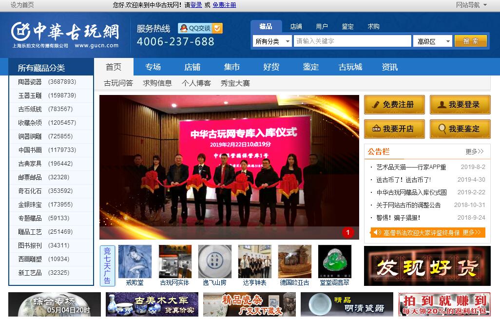 上海樂拍文化傳播有限公司,是國內(nèi)首家用域名進行工商注冊的公司,注冊資金1666萬,旗下?lián)碛须娮由虅站W(wǎng)站中華古玩網(wǎng)(www.gucn.com)成立于2007年12月,自建立之日起一直是極具人氣的古玩收藏藝術(shù)品電子商務網(wǎng)站,給廣大古董收藏愛好者提供了一個自由交流、探討、學習、安全便捷的交易平臺,并為藝術(shù)品收藏在互聯(lián)網(wǎng)上的發(fā)展發(fā)揮了極大作用!經(jīng)過7年的發(fā)展,我們已經(jīng)成為中國最好的古玩交易平臺之一。涵蓋古玩交易的所有種類,包含充滿驚喜的地攤撿漏、嚴謹安全的店鋪交易、簡單有效的在線競買和專場、渠道多樣的委托代售。網(wǎng)站注冊會員超過100萬人、日均訪問量200萬,月成交額已過1500萬元,現(xiàn)在仍在穩(wěn)步高速的發(fā)展中。在這里,您會驚訝地發(fā)現(xiàn)原來古董收藏的愛好者有這么多,原來古董還可以這樣玩;在這里,您可以找到關(guān)于收藏品的一切,并進入古董收藏愛好者的多彩世界。我們網(wǎng)站的宗旨是公平、公正、公信,每個會員都是我們的一份子,這就是中華古玩網(wǎng)!