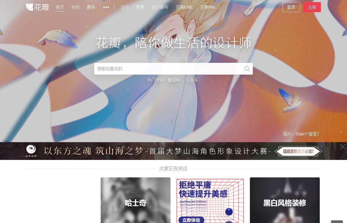 | 網(wǎng)站簡介: 花瓣網(wǎng), 設(shè)計師尋找靈感的天堂!圖片素材領(lǐng)導者,幫你采集、發(fā)現(xiàn)網(wǎng)絡(luò)上你喜歡的事物。你可以用它收集靈感,保存有用的素材,計劃旅行,曬曬自己想要的東西。花瓣網(wǎng)是杭州緯音智網(wǎng)絡(luò)有限公司旗下網(wǎng)站。 |