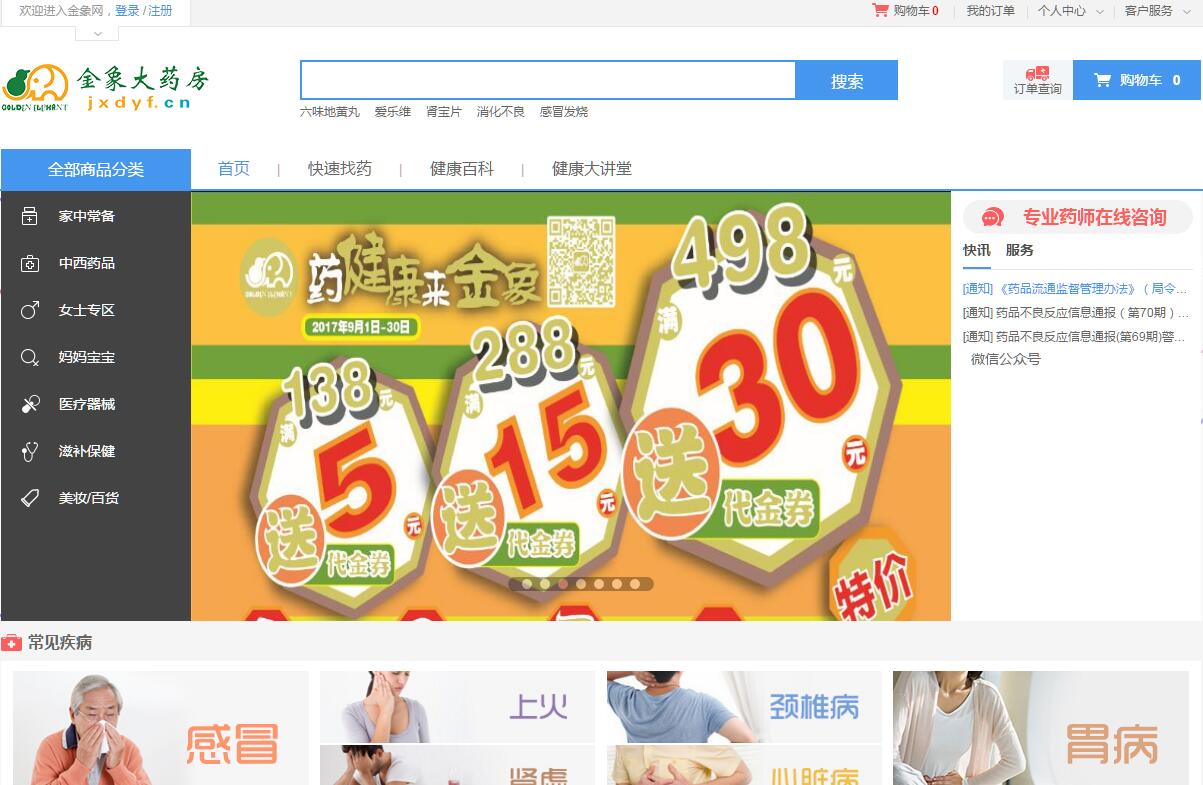 金象網(wǎng)上藥店(金象大藥房網(wǎng)上商城)經(jīng)營(yíng)產(chǎn)品包括日常藥品、母嬰用品、兩性用品、營(yíng)養(yǎng)保健、醫(yī)療器械、隱形眼鏡等。網(wǎng)上購藥選擇金象網(wǎng),100%正品保證、方便快捷、安全放心。金象網(wǎng)隸屬于北京金象大藥房醫(yī)藥連鎖有限責(zé)任公司,由北京金象在 線網(wǎng)絡(luò)科技有限公司負(fù)責(zé)運(yùn)營(yíng),是國(guó)家批準(zhǔn)的正規(guī)、合法的網(wǎng)上藥店。金象網(wǎng)于2007年6月18日上線,歷經(jīng)近7年的發(fā)展,已成為醫(yī)藥零售電子商務(wù)行業(yè)的領(lǐng) 軍企業(yè)。金象網(wǎng)商品種類齊全,設(shè)有日常用藥、慢性病藥、男科婦科、孕嬰童 類、新藥特藥、營(yíng)養(yǎng)保健、參茸精品、醫(yī)療器械、成人保健、美妝護(hù)理、家居百貨11大類商品。這些商品都來自于金象大藥房物流中心,與北京、上海、天津、河 北等地300多家門店共享,商品質(zhì)量放心、可靠。用戶登錄金象網(wǎng),便可輕松享受藥品查詢、健康咨詢、商品訂購和送貨上門的全程服務(wù)。