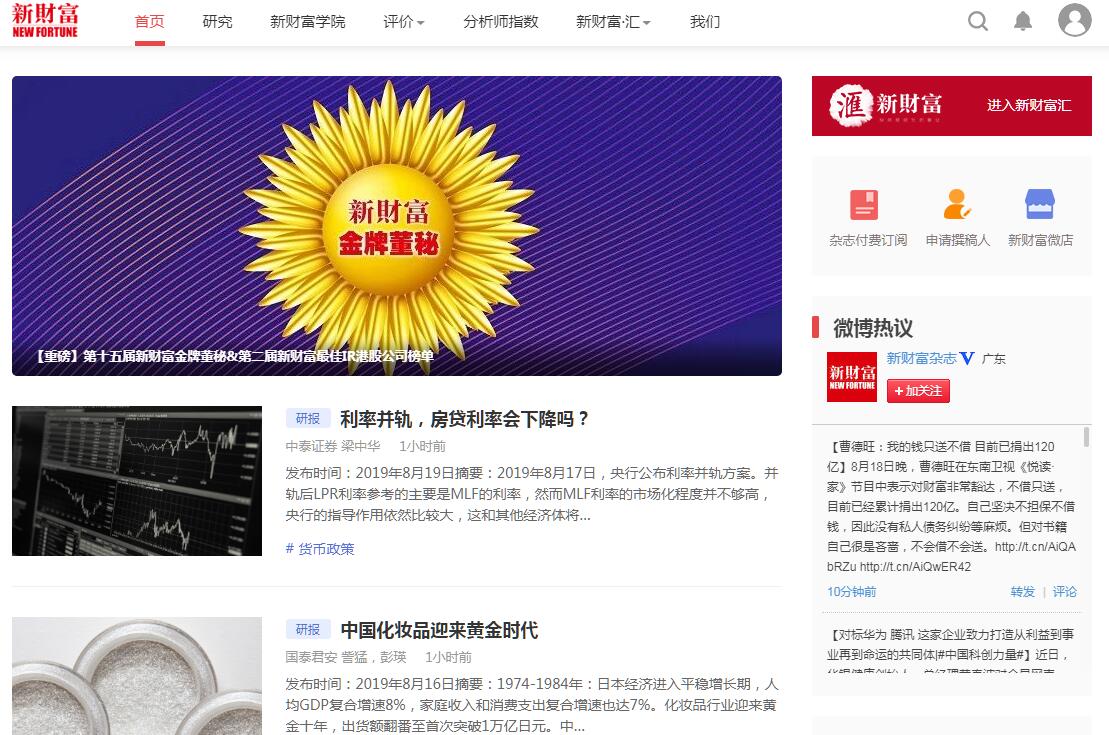 | 網(wǎng)站簡介: 新財富定位于以評價和數(shù)據(jù)為主要產品的金融服務機構,致力于成為中國資本市場的標準提供者,通過主觀與客觀相結合的方式,對資本市場的重要參與主體進行透明、獨立的專業(yè)評價,并提供基于這些評價的資本市場數(shù)據(jù)和分析,為市場各方提供投資、融資、執(zhí)業(yè)等方面的參考,促進資本市場更有效率地配置資源?!靶仑敻蛔罴逊治鰩煛?、“新財富金牌董秘”等新財富系列專業(yè)排名,每年影響數(shù)十萬億的機構資金流向。與此同時,通過領先財經(jīng)雜志《新財富》和超過300萬粉絲集群的官方微博、微信等新媒體平臺,新財富的所有評價、研究成果及其衍生內容獲得廣泛傳播,并與用戶產生深度交互。 |