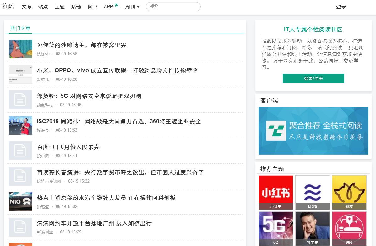 | 網(wǎng)站簡介: 推酷專注于IT領(lǐng)域的信息挖掘和聚合推薦,期望通過技術(shù)解決信息獲取方面的諸多問題。 更長遠(yuǎn)地,推酷期望能成為IT知識整合社區(qū),給你一站式閱讀、學(xué)習(xí)、交流的平臺。目前主推的產(chǎn)品有:1)個性化文章聚合推薦,提供的內(nèi)容涵蓋科技、技術(shù)、設(shè)計、營銷等方面。我們沒有小編,聚合和推薦的內(nèi)容完全依賴于分分鐘不停歇的推薦系統(tǒng)。2)IT類的線下線上活動聚合推薦,目前收錄的活動應(yīng)該是國內(nèi)最豐富的,但活動頻道還有很長的路要走。除了網(wǎng)站,我們還提供優(yōu)質(zhì)的安卓和iOS客戶端方便你的閱讀。 |