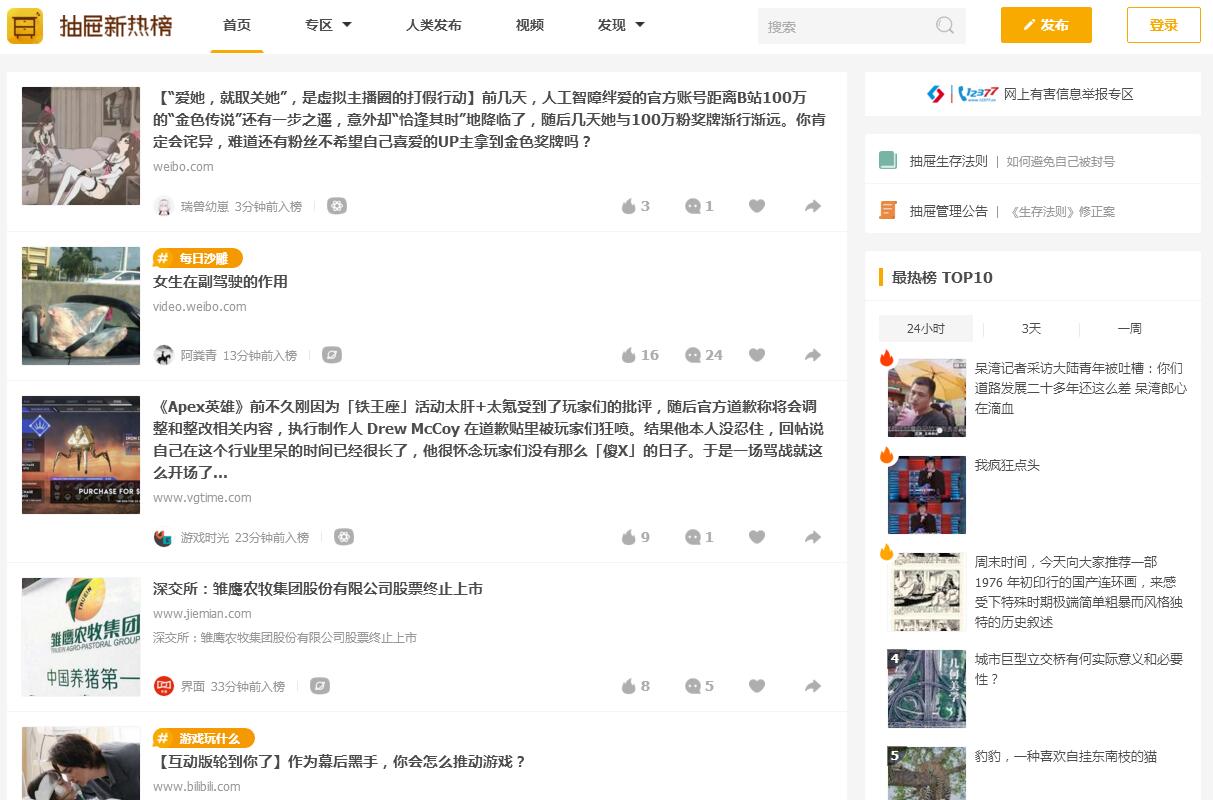 抽屜新熱榜,匯聚每日搞笑段子、熱門圖片、有趣新聞。它將微博、門戶、社區(qū)、bbs、社交網(wǎng)站等海量內(nèi)容聚合在一起,通過用戶推薦生成最熱榜單??闯閷闲聼岚?,每日熱門、有趣資訊盡收眼底。1987年9月14日,北京計算機(jī)應(yīng)用技術(shù)研究所內(nèi)發(fā)出了中國第一封電子郵件:“Across the Great Wall,we can reach every corner in the world.(越過長城,我們可以觸摸世界的任意一個角落)”,當(dāng)時整個中國互聯(lián)網(wǎng)一天的資訊量可以用一張兩指寬的紙條記錄下來。今天,即使窮盡你的一生也不可能讀完整個互聯(lián)網(wǎng)一分鐘內(nèi)產(chǎn)生的資訊。作為工具的互聯(lián)網(wǎng)已經(jīng)進(jìn)化成龐然大物。 但我們深信:工具必將被工具馴服。抽屜新熱榜隸屬于北京格致璞科技有限公司(www.Gozap.com),簡稱Gozap。Gozap是一個多終端信息整合平臺。基于此平臺將陸續(xù)推出其他服務(wù)。用戶可使用同一帳號登錄所有Gozap服務(wù)。抽屜新熱榜處理的是人和信息的關(guān)系,目的是在未來發(fā)展成為社會化信息聚合平臺,向用戶高效、友好的提供有趣、熱門內(nèi)容,同時可以讓用戶分享的資訊、評論得到快速的傳播。