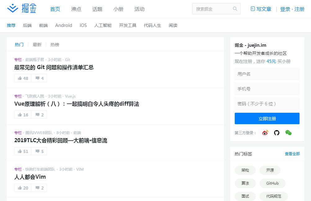 | 網(wǎng)站簡(jiǎn)介: 掘金是一個(gè)幫助開發(fā)者成長(zhǎng)的社區(qū),是給開發(fā)者用的 Hacker News,給設(shè)計(jì)師用的 Designer News,和給產(chǎn)品經(jīng)理用的 Medium。掘金的技術(shù)文章由稀土上聚集的技術(shù)大牛和極客共同編輯為你篩選出最優(yōu)質(zhì)的干貨,其中包括:Android、iOS、前端、后端等方面的內(nèi)容。用戶每天都可以在這里找到技術(shù)世界的頭條內(nèi)容。與此同時(shí),掘金內(nèi)還有沸點(diǎn)、掘金翻譯計(jì)劃、線下活動(dòng)、專欄文章等內(nèi)容。即使你是 GitHub、StackOverflow、開源中國(guó)的用戶,我們相信你也可以在這里有所收獲。 |