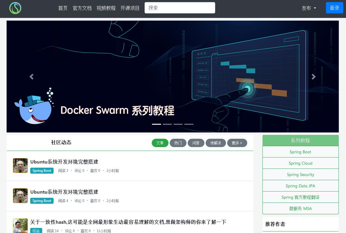 | 網(wǎng)站簡(jiǎn)介: Spring For All 垂直技術(shù)社區(qū)(spring4all.com),國(guó)內(nèi)首個(gè) Spring 及 Spring Cloud 構(gòu)建微服務(wù)架構(gòu)的交流社區(qū)。更好地為大家提供 Spring 技術(shù)內(nèi)容分享,大家可以到這里獲得更多關(guān)于 Spring Cloud 以及其他豐富技術(shù)內(nèi)容,更有程序猿DD、周立、程超、小馬哥、泥瓦匠BYSocket等知名博主、開源愛好者為您答疑解惑。 |