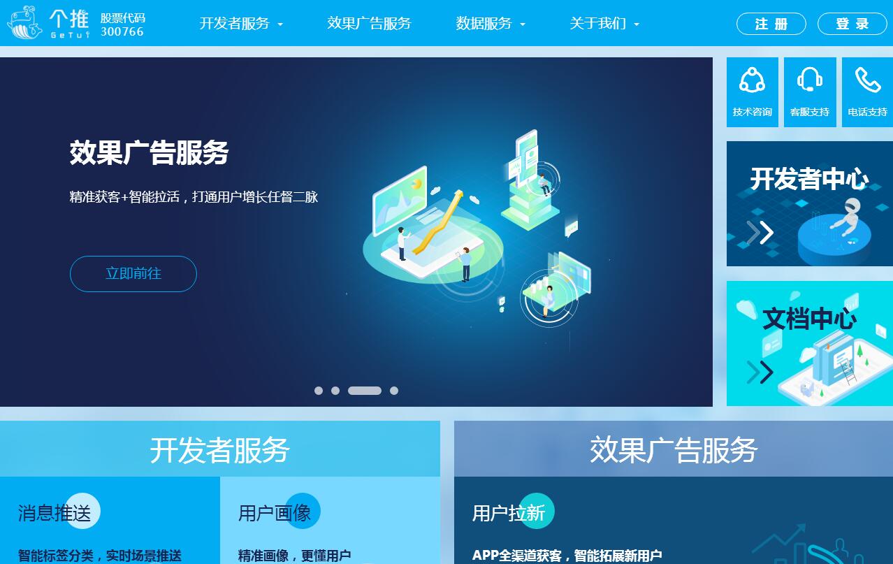 個(gè)推(浙江每日互動(dòng)網(wǎng)絡(luò)科技股份有限公司)是專業(yè)的數(shù)據(jù)智能服務(wù)商,以數(shù)據(jù)技術(shù)為引擎,為各行業(yè)提供大數(shù)據(jù)解決方案,致力于構(gòu)建數(shù)據(jù)智能新生態(tài)。自2010年成立以來,個(gè)推依托出色的消息推送技術(shù),成功服務(wù)了包含人民日?qǐng)?bào)、新華社、CCTV、新浪微博、京東、網(wǎng)易新聞、滴滴出行等在內(nèi)的數(shù)十萬APP,覆蓋數(shù)十億移動(dòng)終端。基于移動(dòng)互聯(lián)網(wǎng)領(lǐng)域的海量數(shù)據(jù)積累與創(chuàng)新的技術(shù)理念,個(gè)推率先實(shí)現(xiàn)了數(shù)據(jù)智能在多元經(jīng)濟(jì)的落地應(yīng)用,引領(lǐng)著產(chǎn)業(yè)智能發(fā)展的新風(fēng)向。目前,個(gè)推業(yè)務(wù)主要包括為移動(dòng)應(yīng)用開發(fā)者提供運(yùn)營推廣、消息推送、數(shù)據(jù)統(tǒng)計(jì)和用戶畫像等服務(wù),以及為品牌營銷、金融風(fēng)控、全域旅游和智慧城市等各垂直領(lǐng)域提供大數(shù)據(jù)解決方案。