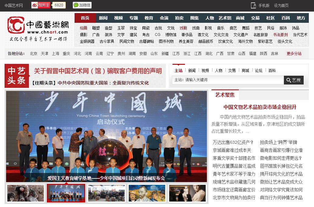 中國藝術(shù)網(wǎng)隸屬于北京世紀(jì)國奧文化傳播有限公司,是匯集中國文化藝術(shù)類的資源整合平臺(tái),是目前中國文化藝術(shù)類網(wǎng)站涉及最廣、受眾人群最多的文化藝術(shù)類數(shù)字資源平臺(tái),是中國傳統(tǒng)文化、民族文化、當(dāng)代藝術(shù)、文物收藏類的一個(gè)全方位互動(dòng)、全面提升價(jià)值、網(wǎng)羅文化藝術(shù)類傳播資源、影響知名度延續(xù)擴(kuò)大的唯一精準(zhǔn)對(duì)應(yīng)的超級(jí)平臺(tái)。中國藝術(shù)網(wǎng)不是單一的書畫在線拍賣交易網(wǎng)站。是為各類傳統(tǒng)民族文化藝術(shù)收藏類網(wǎng)絡(luò)人群提供了最全面、快捷、便利的資訊交流平臺(tái)。在此基礎(chǔ)上要將中國藝術(shù)網(wǎng)做成代表文化藝術(shù)收藏的最民族化的高標(biāo)準(zhǔn)的品牌。中國藝術(shù)網(wǎng)不是單一的藝術(shù)收藏類資訊網(wǎng)站。中國藝術(shù)網(wǎng)按照民族文化藝術(shù)門類詳盡細(xì)致劃分網(wǎng)站欄目,并將及時(shí)更新行業(yè)資訊與活動(dòng),為文化藝術(shù)收藏網(wǎng)友完成瑣碎的信息資源的查詢工作,打開網(wǎng)頁就能將藝術(shù)動(dòng)態(tài)一覽無余,方便相關(guān)信息檢索。與此同時(shí),我們也不滿足于簡單地網(wǎng)絡(luò)信息整理工作,我們所做的是將行業(yè)報(bào)道與文化發(fā)展趨勢相結(jié)合,以專題的形式將資訊線索與其整個(gè)發(fā)展脈絡(luò)相聯(lián)系,結(jié)合圖片、視頻、訪談、文獻(xiàn)等內(nèi)容,挖掘出背后的價(jià)值,將藝術(shù)類資訊以一種深刻、獨(dú)特的視角報(bào)道展示。中國藝術(shù)網(wǎng)不是單一的藝術(shù)收藏類網(wǎng)站。我們做的是中華五千年文化藝術(shù)、是包羅所有藝術(shù)門類的全景式網(wǎng)站,不單一涉獵當(dāng)代藝術(shù)品或古董珍奇,不局限于書法繪畫或工藝制品,更不會(huì)從交易額大小、成交與否去判斷藝術(shù)的價(jià)值。我們帶著對(duì)中國傳統(tǒng)文化藝術(shù)的詮釋,尊重各類藝術(shù)。我們做的是中華五千年的文化之韻,呈現(xiàn)的是多而廣、大而全的中國網(wǎng)絡(luò)文化藝術(shù)資訊類的匯集平臺(tái)。我們要的不是虛的廣告投放量,要的是真心愛生活、真心愛文化、真心愛藝術(shù)以及支持中國傳統(tǒng)文化藝術(shù)發(fā)展的全球各界人士的關(guān)注。中國藝術(shù)網(wǎng)的優(yōu)勢是從文化藝術(shù)的各個(gè)層面整合文化藝術(shù)類受眾網(wǎng)絡(luò)人群,以內(nèi)容吸引擴(kuò)大參與者、發(fā)布者的影響力、傳承力、宣傳力,有目標(biāo)有目的的匯集梳理,吸引邊緣相關(guān)業(yè)界各類熱心文化藝術(shù)人士關(guān)注,從而達(dá)到網(wǎng)絡(luò)傳播的實(shí)質(zhì)作用。我們所做的只是三件事:1.整合文化藝術(shù)各門類的提供方、2.整合引導(dǎo)對(duì)中國五千年文化藝術(shù)感興趣的有識(shí)之士、3.關(guān)注參與的需求者、整合中國文化藝術(shù),將各藝術(shù)門類從線下搬到線上。踏著歷史腳步前行至今的各門類文化藝術(shù)有著各自不同的產(chǎn)生背景和經(jīng)濟(jì)基礎(chǔ),文化藝術(shù)的發(fā)展自然不能脫離違背經(jīng)濟(jì)規(guī)律,但是作為當(dāng)代社會(huì)互聯(lián)網(wǎng)時(shí)代的今天不應(yīng)將藝術(shù)品標(biāo)成天價(jià),更不應(yīng)將文化藝術(shù)以數(shù)字的大小多少、價(jià)格的高低貴賤作為衡量藝術(shù)價(jià)值的標(biāo)準(zhǔn)。數(shù)碼時(shí)代不是數(shù)字時(shí)代,數(shù)字不代表價(jià)值的取向。人生觀、價(jià)值觀、藝術(shù)觀與對(duì)文化藝術(shù)的追求熱愛應(yīng)該是超脫了金錢與價(jià)格的。中國藝術(shù)網(wǎng)需要的是正確真實(shí)的文化藝術(shù)氛圍,我們真心的希望中國藝術(shù)網(wǎng)能給您及家人帶來方便快捷的中國文化藝術(shù)資源的呈現(xiàn)并在此品味傳統(tǒng)文化藝術(shù)的新方式…——在這里您將會(huì)找到您關(guān)注、關(guān)心、熱愛的,在這里更會(huì)發(fā)現(xiàn)您想不到的多姿多彩的中國傳統(tǒng)文化藝術(shù)類資源。