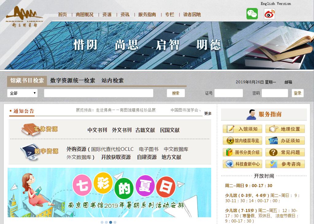南京圖書館是江蘇省省級公共圖書館,國家一級圖書館。其前身可追溯到1907年由清兩江總督端方創(chuàng)辦的江南圖書館,地址南京龍蟠里惜陰書院舊址,總辦繆荃孫。辛亥革命后,曾多次變更館名。1927年,因?qū)嵭写髮W(xué)區(qū)制,易名為第四中山大學(xué)國學(xué)圖書館。1928年5月,復(fù)更名為國立中央大學(xué)國學(xué)圖書館。館長柳詒徵。1929年10月,大學(xué)區(qū)制取消,定名為江蘇省立國學(xué)圖書館,直屬江蘇省教育廳。建國初期仍沿用此名,由華東軍政委員會文化部領(lǐng)導(dǎo)。1952年10月并入國立南京圖書館。1933年4月南京國民政府教育部委托蔣復(fù)璁籌建的國立中央圖書館,地址成賢街。1937年西遷重慶,1946年返都南京。1948年底,蔣復(fù)璁等奉命攜館藏珍籍13萬冊去臺灣。1949年5月,由南京市軍事管制委員會去接管。1950年3月19日,中央圖書館奉中央文化部令,正名為國立南京圖書館,由文化部文物局和華東軍政委員會文化部雙重領(lǐng)導(dǎo),館長賀昌群。1954年,大行政區(qū)已撤消,同時江蘇已經(jīng)建省,需要一個省級館,為此,文化部于是在7月將國立南京圖書館改名為南京圖書館,直屬江蘇省文化廳領(lǐng)導(dǎo)至今。1955年起,汪長炳任副館長、館長17年。南京圖書館大行宮館區(qū)(新館)于1998年正式立項,2002年正式動工,2006年11月落成并部分對外開放,2007年實現(xiàn)全面開放。新館地處南京市大行宮地段,與總統(tǒng)府隔街相望。建筑占地面積2.52萬平方米,建筑面積約7.8萬平方米,設(shè)計總高41.1米,藏書容量1200萬冊,地下局部2層,地上9層。南圖館標的基本形采用了有“中國書圣”之稱的王羲之所書“書”字的側(cè)形,體現(xiàn)著南京圖書館獨特的文化歷史傳承。同時是新館建筑造型的抽象化與書架上書籍的抽象性,體現(xiàn)著圖書館的功能與傳播作用。館標的基本形亦是英文字母“N”與“L”的中式書寫,體現(xiàn)著融合與傳薪的結(jié)果。館標所包涵的理念分為外部與內(nèi)部兩方面。對外它的形態(tài)體現(xiàn)的是:“書山有路勤為徑”;對內(nèi)它的形態(tài)傳遞的是“傳承、傳播、傳薪”的意念,即“我們是文化的傳承者、我們是理想的傳播者、我們是精神的傳薪者”?!跋ш幧兴?,啟智明德”是南京圖書館新確立的館訓(xùn)?!跋ш幧兴肌鳖櫭剂x就是珍惜時光、崇尚思考,“惜陰”強調(diào)“學(xué)”,“尚思”強調(diào)“思”,無論是對讀者來說,還是對南圖人來說,“學(xué)思并重”皆應(yīng)成為自身的素養(yǎng)和修為;“啟智明德”意在啟發(fā)智慧,努力引導(dǎo)使大家的道德達到完美的理想境界。這八個字是對南京圖書館繼承傳統(tǒng)文化精神、體現(xiàn)本館性質(zhì)和職能的準確概括。2007年新館建成開放以來,南圖不斷推進各項基礎(chǔ)工作,提升讀者服務(wù)質(zhì)量,落實各種惠民服務(wù)措施,同時也充分利用自身資源優(yōu)勢,以多種形式普及傳統(tǒng)文化,引領(lǐng)閱讀風(fēng)尚,拓展閱讀視野。全年提供閱覽、外借、參考咨詢、OPAC查詢、數(shù)據(jù)庫檢索、文獻傳遞、館際互借、流動服務(wù)、講座、展覽、培訓(xùn)、讀者活動等服務(wù)。南京圖書館實行全面免費開放,在功能布局上,主要體現(xiàn)以“用”為主、以讀者為中心的理念,以開架為主要服務(wù)方式,實現(xiàn)藏、借、閱、咨詢、管理的一體化。截至2017年底,藏書總量超過1200萬冊,僅次于國家圖書館和上海圖書館,位居全國第三。其中古籍160萬冊,包括善本14萬冊;民國文獻70萬冊。館藏中不乏唐代寫本,遼代寫經(jīng),宋、元、明、清歷代寫印珍本,已有524種入選國家珍貴古籍名錄。數(shù)字資源有“中國知網(wǎng)”、“瀚堂典藏”、“Proquest”等引進數(shù)據(jù)庫及自建數(shù)據(jù)庫等共50余種,讀者可在館免費使用。目前南圖讀者證總量超過100萬張,日均到館讀者達8000人次。近幾年來,南京圖書館從四個方面扎實開展各項工作,積極貫徹落實上級文件、會議精神和工作指示,充分發(fā)揮南圖功能作用;著力加強內(nèi)部建設(shè),提高員工的信心和實力;舉辦各類讀者活動,調(diào)整館舍布局,改善閱覽環(huán)境,優(yōu)化讀者閱讀體驗;推出多項措施,選用人才,擢用干才,改善職工工作狀態(tài),增強南圖內(nèi)在動力,從而推進圖書館事業(yè)高效發(fā)展。同時,南圖按照購書、編書、借書、藏書、收書、護書、研書、增書的“八書”理論,結(jié)合“三個兩”,即“兩個作為”、“兩大調(diào)整”、“兩個聚焦”,積極推動各項工作?!皟蓚€作為”就是面對新形勢、新任務(wù)、新要求,我們自加壓力,主動作為和積極作為;“兩大調(diào)整”就是根據(jù)我們實際,充分挖掘資源優(yōu)勢,拓寬發(fā)展空間,大跨度的進行結(jié)構(gòu)調(diào)整和功能調(diào)整;“兩個聚焦”就是一切從大局出發(fā)、從發(fā)展出發(fā),聚焦創(chuàng)新和聚焦惠民。近年來,我們恪盡職守,不忘初心,以始終如一的態(tài)度珍藏典籍、服務(wù)讀者,以堅如磐石的毅力銳意改革、求變求新,以高瞻遠矚的胸襟藏用并舉、籌劃全局。在基礎(chǔ)設(shè)施建設(shè)、讀者服務(wù)創(chuàng)新、惠民措施落實、傳統(tǒng)文化傳承等方面完成了一系列具有重大社會影響和顯著社會效益的重點工程和項目。在全館廣大干部職工的共同努力下,近年