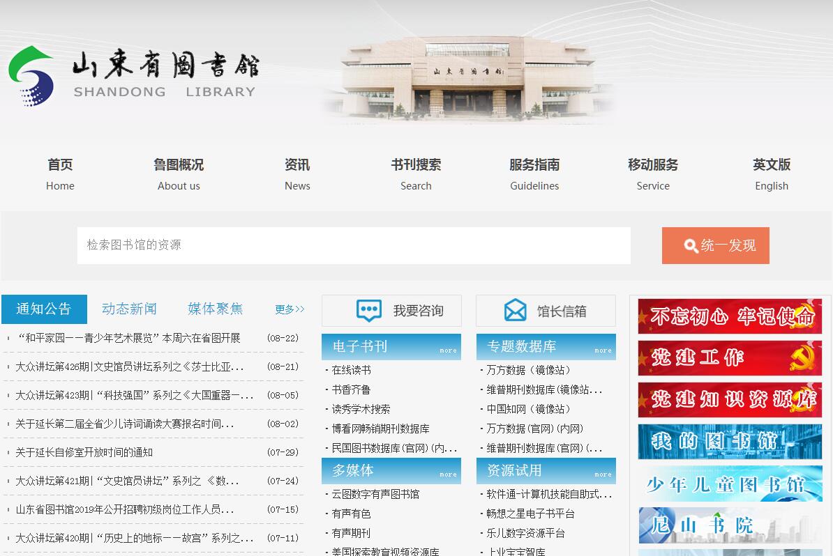山東省圖書館創(chuàng)建于1909年(清宣統(tǒng)元年)。是我國十大圖書館之一,以歷史悠久、館藏宏富而著稱。據(jù)《山東創(chuàng)建圖書館記》載,山東提學(xué)使羅正鈞于省城舊貢院東北隙地創(chuàng)建圖書館仿浙江寧波范氏“天一閣”舊制, 院內(nèi)古木假山,曲水拱橋,極為風(fēng)雅別致,人稱“歷下風(fēng)物,此為最勝”。經(jīng)過近一個世紀(jì)幾代人的嘔心瀝血,艱苦奮斗,辛勤訪求,藏書規(guī)模日趨宏大,特色日趨鮮明,截至目前形成了具有鮮明特色的系統(tǒng)的藏書體系。其中輕工、醫(yī)學(xué)、哲學(xué)等門類的收藏已達研究級水平,而齊魯方志專藏、海源閣專藏、易經(jīng)專藏、山東革命文獻等收藏為海內(nèi)翹楚。齊魯方志海內(nèi)現(xiàn)存約600種,而本館館藏528種,善本58種,《(萬歷)兗州府志》則為海內(nèi)孤本。海源閣專藏計2280種32000冊,約占海源閣現(xiàn)存藏書的三分之二,并有較多名人手跡,如林則徐、翁同書、吳式芬、錢儀吉、許瀚等人的書札。本館收藏易經(jīng)文獻1317種,總計2205個版本,近萬冊。另外,該館收藏的唐人寫經(jīng)卷、宋刻蝴蝶裝《文選》、宋刻巾箱本《萬卷菁華》、蒲松齡手稿《聊齋文集》、王士禎批?!独錾椒考犯灞镜染鶠閭魇勒淦?。館藏期刊涵蓋各個學(xué)科,基本形成了一個具有特色的綜合性館藏報刊體系。其中辛亥革命時期的山東獨立同盟會機關(guān)報《齊魯公報》、原中國共產(chǎn)黨渤海區(qū)委機關(guān)報《渤海日報》、膠東區(qū)委機關(guān)報《大眾報》等資料文獻彌足珍貴。館藏外文書刊則以輕工、化工、電子技術(shù)、環(huán)境保護、醫(yī)藥衛(wèi)生方面的文獻為特色,如美國《化學(xué)文摘》從1907年收藏至今,《日本特許公報》從60年代初收藏至今,還有《美國專利文摘》、《世界專利索引》、《美國工程索引》都具有很高的研究和開發(fā)利用價值。山東省圖書館作為國家舉辦的綜合性公共圖書館,是社會主義科學(xué)、教育、文化事業(yè)的重要組成部分,是向社會公眾提供圖書借閱和信息咨詢服務(wù)的學(xué)術(shù)性機構(gòu)。他們堅持“一切為了讀者”的指導(dǎo)思想,利用豐富的館藏,通過閱覽、外借、課題檢索、解答咨詢、信息服務(wù)、翻譯、舉辦展覽、報告講座等多種形式為讀者服務(wù)?,F(xiàn)有對外服務(wù)窗口44個,每周開放73.5小時,辦理各種借書證9個,日平均接待讀者近五千余人次,并與日本、朝鮮、美國、英國、香港等國家和地區(qū)建立了文獻交換關(guān)系。黨的十一屆三中全會以來,隨著改革開放的深入,圖書館事業(yè)的發(fā)展進入了快車道。近年來,尤其黨的十四屆六中全會以來,山東省圖書館堅持“以人為本,讀者第一”的服務(wù)理念,深化改革,內(nèi)抓管理,外樹形象,打破傳統(tǒng)的思維定勢,更新觀念,統(tǒng)一思想,結(jié)合自身的具體實際,確定了建設(shè)國內(nèi)一流圖書館的奮斗目標(biāo)。推行了一系列的措施,以滿足改革開放和時代的需要,推動社會的文明和發(fā)展,為兩個文明建設(shè)服務(wù)。新開了暢銷書閱覽室、電子聲像室、國外工藝美術(shù)閱覽室,電腦圖書閱覽室、港臺資料閱覽室及讀者書店、咨詢服務(wù)部等,豐富了圖書館的服務(wù)內(nèi)容,方便了讀者,所有這一切服務(wù)工作,能夠使廣大讀者高興而來,滿意而去,因而在社會上產(chǎn)生了良好的影響。利用高科技手段,全面推進圖書館現(xiàn)代化?,F(xiàn)代社會的科學(xué)發(fā)展一日千里,高科技手段的普及及應(yīng)用使圖書館從觀念到服務(wù)方式都發(fā)生了巨大的變化。山東省圖書館以此為契機,廣泛利用先進技術(shù),促進圖書館的改革和發(fā)展,從而豐富館藏,簡化工作環(huán)節(jié),減輕勞動強度,深化服務(wù)層次,提高服務(wù)質(zhì)量和水平,使讀者能更及時、準(zhǔn)確、快捷獲取信息。目前,中外文圖書書目數(shù)據(jù)庫已建成;網(wǎng)上的館際互借和學(xué)術(shù)期刊檢索初具規(guī)模;采訪、編目、流通、報刊、外文、特藏等部門已實現(xiàn)微機管理;利用縮微技術(shù)保護珍貴文獻也取得可喜成績……使山東省圖書館向全面現(xiàn)代化邁出了堅實的一步,取得了可喜的成績。先后榮獲“全國文化先進集體”、“讀者喜愛的圖書館”、“山東省職業(yè)道德建設(shè)十佳單位”和省級“精神文明單位”等榮譽稱號。 世紀(jì)之交,煥發(fā)勃勃生機的山東省圖書館挑戰(zhàn)和機遇并存,希望與輝煌同在。在省委、省政府、省人大,省政協(xié)和文化教育主管部門的關(guān)懷和領(lǐng)導(dǎo)下,一個全省文化系統(tǒng)建國以來,最大的投資項目,占地65畝,建筑總面積5萬平方米。新館已建成并于2002年10月正式對外開放。山東省圖書館新館位于濟南高新技術(shù)開發(fā)區(qū),于1994年動工興建。整個工程分兩期進行,第一期工程綜合閱覽樓,建筑面積為35830平方米,投資11048.1萬元。主體建筑為六層中空式,內(nèi)部全部采用大開間柱網(wǎng)結(jié)構(gòu),柱網(wǎng)間距7.2米,每層面積自2000余平方米至6000余平方米不等。建筑采取模數(shù)化設(shè)計,氣勢恢宏而結(jié)構(gòu)緊湊,堅實厚重而不失俊雅,它是齊魯文化的現(xiàn)代象征。二期工程書庫樓共12層。新館適應(yīng)現(xiàn)代信息化、開放型圖書館的要求,開展多