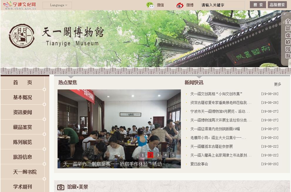 寧波市天一閣博物館是以天一閣藏書樓為核心、藏書文化為特色的專題性博物館,占地面積約為31000平方米,現(xiàn)為全國重點(diǎn)文物保護(hù)單位、全國重點(diǎn)古籍保護(hù)單位和國家AAAAA級旅游景區(qū)。以其悠久精深的藏書文化、宛如天開的園林藝術(shù)、古樸典雅的古建風(fēng)格及便捷優(yōu)越的地理位置,每年吸引著來自世界各地的游客前來觀光休閑。天一閣藏書樓是我國現(xiàn)存歷史最久的私家藏書樓,也是世界上現(xiàn)存最早的三個私家藏書樓之一,建于明嘉靖四十至四十五年(公元1561—1566年)之間,原為明兵部右侍郎范欽的藏書處?,F(xiàn)藏各類古籍近30萬卷,其中珍槧善本8萬余卷,尤以明代地方志和科舉錄最為珍貴。近年來,我館事業(yè)發(fā)展迅速,先后將陳氏宗祠、秦氏支祠等文保點(diǎn)納入統(tǒng)一管理。其中,陳氏宗祠展示了麻將的起源及與寧波的歷史溯源。建于二十世紀(jì)二十年代的秦氏支祠是第五批全國重點(diǎn)文物保護(hù)單位,其獨(dú)特的祠堂文化、精湛的民間工藝為游客嘆服。寧波市天一閣博物館是寧波市文化廣電旅游局下屬的從事公益服務(wù)的事業(yè)單位(公益一類),機(jī)構(gòu)規(guī)格相當(dāng)于行政正處級。其主要工作職責(zé)是:承擔(dān)天一閣景區(qū)的保護(hù)管理工作;收藏展覽文物古籍,弘揚(yáng)名族文化;承擔(dān)文物古籍征集、鑒定、登編、修復(fù)、保管、陳列、宣教、研究,舉辦、引進(jìn)文物展覽,提供文化旅游等開放服務(wù),開展對外文化交流等。