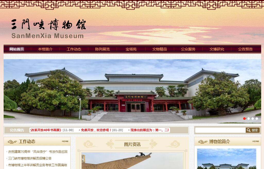 三門峽市博物館位于河南省文物保護單位——陜州故城遺址區(qū),二十世紀八十年代該遺址區(qū)被辟為陜州公園。這里山水一色,素有“四面云山三面水,一城煙樹半城田”之美譽。館區(qū)坐落在唐代孔廟遺址上,占地19800平方米,建筑面積9800平方米,展廳面積4400平方米。仿古園林式建筑風格獨具特色,典雅秀麗,可謂“館中有園,園中有館”。館藏文物15000余件(套),其中三級以上國家珍貴文物1400余件(套),是一座集文物收藏、陳列展示、科學研究、社會教育與文化交流諸功能為一體的綜合性博物館?,F(xiàn)為國家二級博物館,國家文物二級風險防范單位,河南省愛國主義教育示范基地,全國第一批面向社會永久免費開放博物館。如果您想了解三門峽的悠久歷史和燦爛文化,不需要遍訪10496平方公里的崤函大地,《崤函古韻——三門峽古代文明展》就能為您解惑釋疑,幫您找到答案。它按照歷史發(fā)展脈絡(luò),分為“人文初啟”、“古國覓蹤”、“崤函風雨”、“名州望郡”、“襟帶兩京”及“陜虢遺風”六個部分,從不同層面生動再現(xiàn)了三門峽歷史發(fā)展演變軌跡。質(zhì)樸自然的展覽裝飾、簡潔明快的表現(xiàn)手法,與一件件古拙精美的文物融為一體,營造出一個古樸、典雅、和諧的展示氛圍,使您在信步穿越歷史時空的旅程中,心靈受到觸動,精神得到升華。同時,不定期推出的一系列主題鮮明的臨時性展覽,內(nèi)容豐富的社教活動等,也是對綜合性博物館職能的完善和補充。至此,如果您有些許收獲,我們將榮幸之至,這也是博物館人的初衷和期冀!