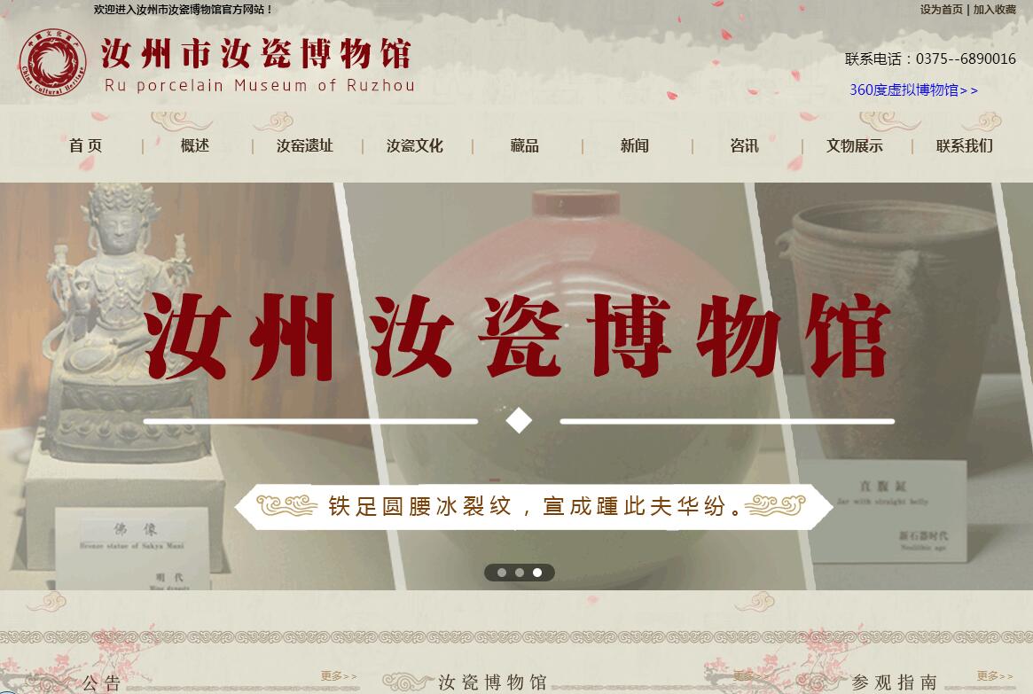 汝瓷博物館籌建于1983年,1985年12月開館,位于汝州市望嵩路65號,設在全國重點文物保護單位----汝州文廟院內(nèi)。博物館總占地面積6400平方米,建筑面積2500平方米,展廳占地面積約2000平方,是目前國內(nèi)唯一的一家以汝瓷為主題的專業(yè)性博物館,主要負責文物收藏、陳列、研究、科普宣傳、教育。館內(nèi)藏品豐富、史料充實,三級以上館藏文物近2000件,展廳內(nèi)包括石器、陶器、瓷器、青銅器、名家書法、碑廊石刻等,全方位多角度地展示了汝州悠久的歷史積淀和深厚的文化底蘊。目前館內(nèi)有多功能展廳8個。陶瓷文物精品展廳,展示汝州市出土的重要的精美的陶瓷文物。瓷片標準展廳,布置兩個展覽內(nèi)容,第一部分是在汝州市出土的宋、元時期各重要瓷器燒制窯口的瓷片標本及部分瓷器燒制工具;第二部分是建國以來,汝州市幾代陶瓷工作者恢復汝窯生產(chǎn)過程中各時期典型代表器物。宋室鴻寶汝貼展廳,布置《汝貼》石刻及拓片。18種汝官瓷仿制品展廳,布置18件由汝州市陶瓷藝人仿燒的汝官瓷作品。代表性非遺項目‘’汝瓷燒制技藝”傳承人展廳,布置汝州市2位國家級傳承人、5位省級傳承人和汝瓷郵票四件套原型汝瓷作品。首屆中國陶瓷成型技能競賽捐贈作品展廳。布置2015年我市承辦的首屆陶瓷成型職業(yè)技能競賽。(河南賽區(qū))中捐贈的優(yōu)秀作品。首屆中國(國際)汝瓷文化節(jié)歷史名窯作品展廳,布置汝窯、鈞窯、耀州窯、礠州窯、越窯、定窯、德化窯、景德鎮(zhèn)等八大歷史名窯經(jīng)典作品。汝州市打擊文物犯罪活動成果展。近年來,汝州市博物館先后獲得河南省大中小學生德育教育基地、愛國主義教育基地、河南省特色文化基地、河南省科普教育基地、黨風廉政教育基地、青年文明號、中國華僑國際文化交流基地等稱號,常年以來,博物館堅持免費開放,特別注重教育功能的發(fā)揮,年接待國內(nèi)外專家、學者、社會團體及學生30萬于人,近期開展“博物館·學校”直通車教育活動。在社會引起廣泛關注和好評,大大提高了汝瓷博物館的社會影響力。