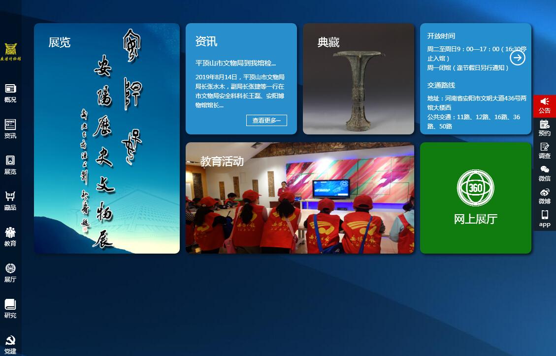 安陽博物館是一座綜合性地方歷史博物館,成立于1958年5月,館址位于安陽市文明大道東段436號?,F(xiàn)為國家二級博物館,河南省和安陽市愛國主義教育示范基地,省文博系統(tǒng)優(yōu)秀愛國主義教育基地,安陽市文明單位、安陽市社科先進(jìn)單位。安陽博物館建筑面積20000余平方米,展廳面積5000余平方米,庫房面積2600余平方米,共有八個文物庫房、七個展廳,舉辦有《殷商社會生活》等四個基本陳列。近年來先后制作了《館藏書畫藝術(shù)作品展》、《安陽民間收藏展》、《安陽市特殊教育學(xué)校學(xué)生藝術(shù)作品展》等數(shù)十個專題展覽,其中《版上天地--館藏安陽地區(qū)木刻版展》獲河南省文物局2012年度優(yōu)秀展覽。安陽博物館現(xiàn)有館藏文物萬余件,包括甲骨、玉器、金屬器、陶瓷器、貨幣、書畫及近現(xiàn)代文物等十幾個類別,時間上起舊石器時代,下迄現(xiàn)代。安陽博物館先后編寫出版了《安陽歷史文物考古論集》、《安陽市博物館館藏文物精品圖錄》等5部著作,其中《安陽地區(qū)木版年畫刻版》獲安陽市社科優(yōu)秀作品二等獎、河南省優(yōu)秀社科普及作品特等獎,另有多項安陽市社科課題獲獎。安陽博物館自2008年新館開館起,實行免費開放,每星期二至星期日上午9時至下午17時開館,每天2次免費講解,其余時段有償服務(wù),設(shè)有語音導(dǎo)覽設(shè)備,團體可預(yù)約。