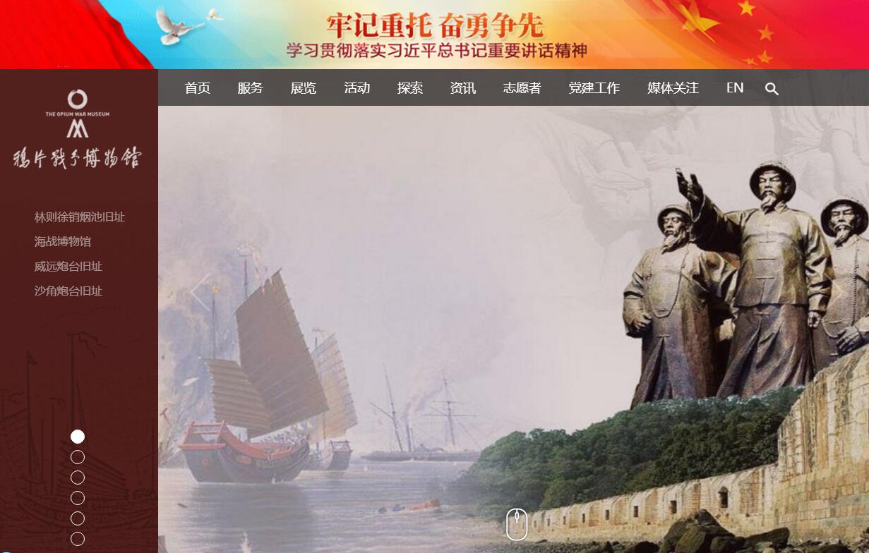 | 網(wǎng)站簡介: 鴉片戰(zhàn)爭博物館(虎門林則徐紀(jì)念館、海戰(zhàn)博物館,三個(gè)館名一套班子),坐落于廣東省東莞市虎門,是紀(jì)念性和遺址性相結(jié)合的專題博物館,館里的林則徐銷煙池與虎門炮臺(tái)舊址是全國重點(diǎn)文物保護(hù)單位,是鴉片戰(zhàn)爭時(shí)期的歷史見證,管理面積約80萬平方米。2016年12月,鴉片戰(zhàn)爭博物館入選《全國紅色旅游景點(diǎn)景區(qū)名錄》。 |