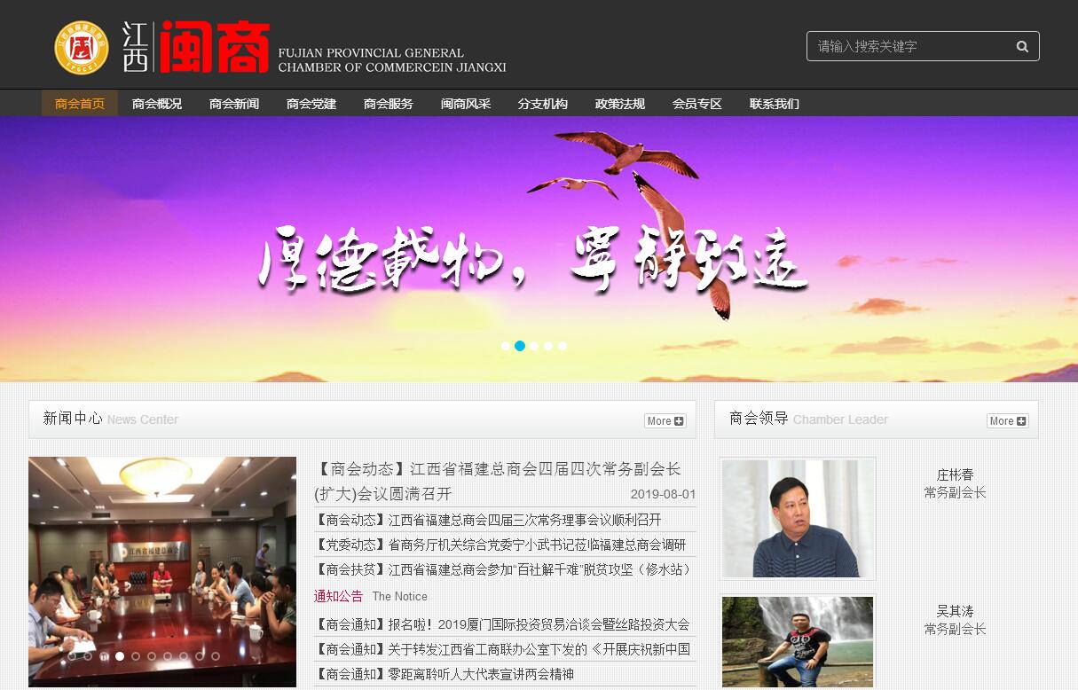 江西省福建總商會(huì)2002年11月23日成立,是經(jīng)原江西省對(duì)外經(jīng)濟(jì)技術(shù)合作辦公室批準(zhǔn)、江西省民政廳登記的具有獨(dú)立法人地位的省級(jí)異地商會(huì),由在贛較強(qiáng)實(shí)力的閩籍企業(yè)組成。第一屆和第二屆會(huì)長(zhǎng)由江西巨成實(shí)業(yè)有限公司董事長(zhǎng)黃祖淵擔(dān)任,第三屆、第四屆會(huì)長(zhǎng)由東方宏利集團(tuán)董事長(zhǎng)韓世忠擔(dān)任。我會(huì)2013年建立了黨組織, 2015年7月經(jīng)江西省商務(wù)廳商務(wù)行業(yè)社會(huì)組織黨委批準(zhǔn),成立中共江西省福建總商會(huì)委員會(huì),是江西省省級(jí)異地商會(huì)第一個(gè)成立黨委的商會(huì)。我會(huì)在吉安、宜春、上饒、新余、鷹潭、撫州、贛州、景德鎮(zhèn)、萍鄉(xiāng)等設(shè)區(qū)市均設(shè)有團(tuán)體會(huì)員機(jī)構(gòu),會(huì)員分布全省各地,會(huì)員企業(yè)5500多家,在贛投資總約8000億元。涉及股權(quán)投資、房地產(chǎn)投資、公路橋梁建設(shè)、機(jī)械設(shè)備制造、采礦冶煉、建材生產(chǎn)與銷售、醫(yī)療健康、酒店管理、商貿(mào)物流、現(xiàn)代農(nóng)業(yè)、新能源、環(huán)??萍?、珠寶玉器、建材家居、計(jì)算機(jī)技術(shù)等眾多領(lǐng)域,為江西引入資金8000多億元,安排就業(yè)近800萬(wàn)人次。閩商愛(ài)心永恒,真誠(chéng)回報(bào)社會(huì),我會(huì)成立十六年來(lái),據(jù)不完全統(tǒng)計(jì)商會(huì)及會(huì)員捐款捐物2億多元。在贛鄱大地描繪了一幅建設(shè)江西造福于民的氣勢(shì)恢宏多彩畫卷。目前,我會(huì)有68名會(huì)員擔(dān)任閩贛兩省各級(jí)人大、政協(xié)、工商聯(lián)121個(gè)職務(wù),代表江西閩商參政議政、獻(xiàn)言獻(xiàn)策、反映訴求,閩商既以點(diǎn)石成金的經(jīng)商才能參與物質(zhì)文明建設(shè),又以充盈的政治智慧參與社會(huì)文明建設(shè),為祖國(guó)科學(xué)發(fā)展、和諧發(fā)展暢述金玉良言,奉獻(xiàn)錦囊妙計(jì)。我會(huì)依法辦會(huì),不斷創(chuàng)新,成績(jī)斐然。連續(xù)兩次被國(guó)家民政部評(píng)為全國(guó)先進(jìn)社會(huì)組織;連續(xù)四次被江西省民政廳評(píng)為全省先進(jìn)社會(huì)組織;連續(xù)六次被江西省工商聯(lián)評(píng)為全省工商聯(lián)系統(tǒng)“先進(jìn)商會(huì)”;2014年被中國(guó)社會(huì)組織評(píng)定為“4A級(jí)商會(huì)”。2017年被中共江西省社會(huì)組織委員會(huì)評(píng)為全省性社會(huì)組織“黨建工作示范點(diǎn)”。2017-2018年度被全國(guó)工商聯(lián)評(píng)委全國(guó)“四好”商會(huì)。江西省領(lǐng)導(dǎo)表?yè)P(yáng)閩商為江西經(jīng)濟(jì)社會(huì)的發(fā)展作出了貢獻(xiàn),福建省黨政主要領(lǐng)導(dǎo)夸獎(jiǎng)我們干得好,為閩商爭(zhēng)了光。