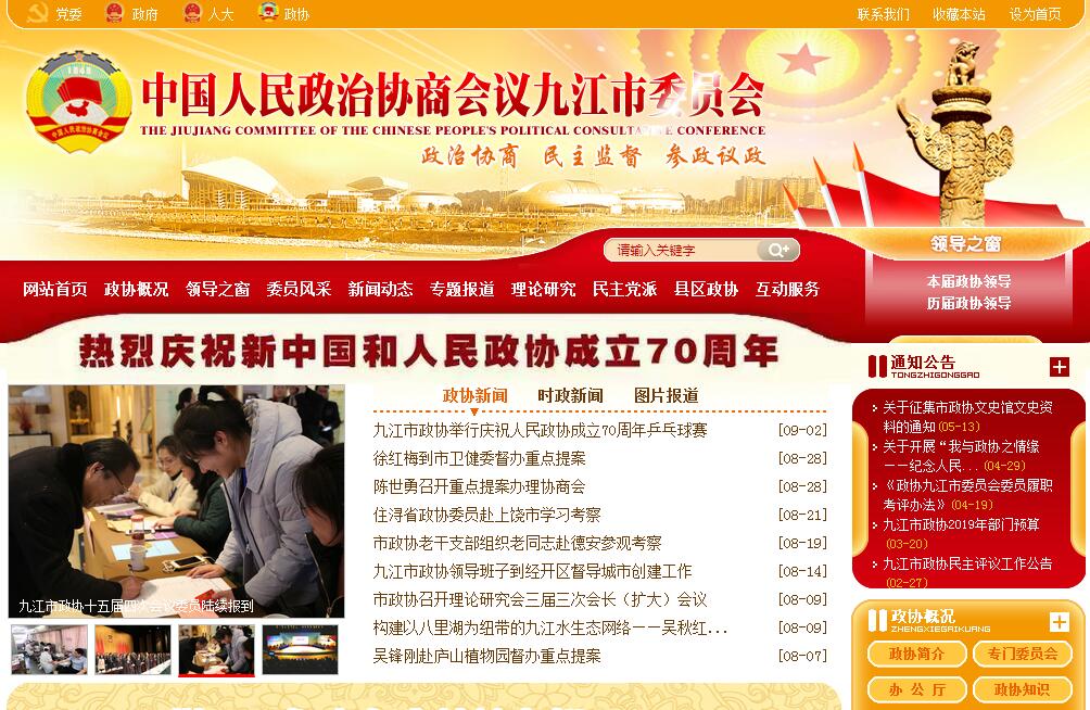 中國人民政治協(xié)商會議江西省九江市委員會(簡稱政協(xié)九江市委員會或九江市政協(xié)),是中共九江市委領(lǐng)導(dǎo)的具有廣泛代表性的地方愛國統(tǒng)一戰(zhàn)線組織。多年來九江市政協(xié)貫徹大團結(jié)、大統(tǒng)一精神,大力發(fā)揚社會主義民主,協(xié)助中共九江市委、市政府落實統(tǒng)戰(zhàn)政策,開展多渠道多形式的政治協(xié)商、民主監(jiān)督,積極參政議政,圍繞經(jīng)濟建設(shè),廣泛開展調(diào)查研究、咨詢服務(wù)、海外聯(lián)誼活動,使政協(xié)工作出現(xiàn)新面貌,促進了九江市的三個文明建設(shè)。80年代以來,九江市政協(xié)在中共九江市委領(lǐng)導(dǎo)下,堅持黨的基本路線,認真貫徹落實黨的一系列方針政策,高舉愛國主義和社會主義旗幟,突出團結(jié)和民主兩大主題,緊緊圍繞黨的工作中心,發(fā)揮優(yōu)勢,履行職能,為促進全市的改革開放和現(xiàn)代化建設(shè),鞏固和發(fā)展安定團結(jié)的政治局面作出了應(yīng)有的貢獻。