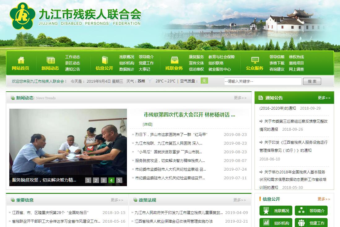 1989年12月19日,九江市殘疾人聯(lián)合會召開第一次代表大會并選舉產(chǎn)生大會主席團(tuán)。市殘聯(lián)主席團(tuán)常設(shè)機(jī)構(gòu)執(zhí)行理事會為副處級單位,隸屬于市民政局。1996年04月24日,中共九江市委第10次常委會研究批準(zhǔn),將市殘聯(lián)提格為正處級人民團(tuán)體,實行機(jī)構(gòu)、計劃、經(jīng)費(fèi)全部單列。殘聯(lián)章程規(guī)定,殘聯(lián)組織的職能有三項,即“代表、服務(wù)、管 理”,《中華人民共和國殘疾人保障法》和《江西省實施〈中華人民共和國殘疾人保障法〉辦法》規(guī)定:各級殘疾人聯(lián)合會受同級人民政府委托,開展殘疾人的康復(fù)、教育、就業(yè)、維權(quán)、文體等工作。1990年,全省開始組建地市級和縣級殘聯(lián),現(xiàn)在全省11個設(shè)區(qū)市、100個縣(市、區(qū))和1592個鄉(xiāng)(鎮(zhèn)、街)都成立了殘聯(lián)。各級殘聯(lián)還設(shè)立了盲人協(xié)會、聾人協(xié)會、肢殘人協(xié)會、智力殘疾人及親友會、精神殘疾人及親友會等專門協(xié)會,還成立了全國首家省級殘疾人企業(yè)家協(xié)會,帶領(lǐng)和組織殘疾人投身全民創(chuàng)業(yè)活動。專門協(xié)會是各類殘疾人的組織,在殘聯(lián)領(lǐng)導(dǎo)下反映本類殘疾人的特殊需求,做好相關(guān)工作。為重視和推動殘疾人事業(yè),全省各級政府還設(shè)立了殘疾人工作委員會,為同級政府的常設(shè)議事機(jī)構(gòu),負(fù)責(zé)指導(dǎo)協(xié)調(diào)有關(guān)部門開展殘疾人工作,解決殘疾人工作中的重大問題。殘工委成員由政府有關(guān)部門的負(fù)責(zé)同志組成,主任由政府分管殘疾人工作的領(lǐng)導(dǎo)同志擔(dān)任。殘工委秘書處設(shè)在同級殘聯(lián),日常工作由殘聯(lián)承擔(dān)。根據(jù)工作職責(zé),內(nèi)設(shè)五個職能科(室):(一)辦公室(九江市人民政府殘疾人工作協(xié)調(diào)委員會秘書處)。協(xié)助領(lǐng)導(dǎo)處理日常工作;負(fù)責(zé)內(nèi)外聯(lián)絡(luò);負(fù)責(zé)機(jī)關(guān)文秘、檔案、保衛(wèi)、保密、統(tǒng)計、信息、來信來訪工作;管理機(jī)關(guān)行政、財務(wù)、國有資產(chǎn)、后勤工作;負(fù)責(zé)機(jī)關(guān)和直屬單位人事管理工作;負(fù)責(zé)綜合性會議組織工作;負(fù)責(zé)募集和管理殘疾人福利基金;開展殘疾人工作的調(diào)查研究;承辦市政府殘疾人工作協(xié)調(diào)委員會的日常工作。(二)組宣科。負(fù)責(zé)指導(dǎo)全市殘聯(lián)系統(tǒng)的組織建設(shè);負(fù)責(zé)市殘聯(lián)代表大會、主席團(tuán)會議及各專門協(xié)會的籌備工作;負(fù)責(zé)殘聯(lián)系統(tǒng)干部培訓(xùn);組織發(fā)放殘疾人證件;負(fù)責(zé)與海外友好團(tuán)體和人士的聯(lián)絡(luò)工作;承擔(dān)各專門系會及評議會的聯(lián)絡(luò)和日常工作;指導(dǎo)基層和社區(qū)殘疾人的康復(fù)、服務(wù)工作,組織志愿者助殘活動, 指導(dǎo)基層殘聯(lián)綜合服務(wù)設(shè)施建設(shè);組織制定實施殘疾人事業(yè)的宣傳和文體工作計劃;協(xié)調(diào)有關(guān)部門為殘疾人提供特需讀物和精神文化產(chǎn)品,推動殘疾人信息交流。(三)康復(fù)科。組織制定和實施殘疾人康復(fù)工作計劃;指導(dǎo)和協(xié)調(diào)殘疾人康復(fù)機(jī)構(gòu)的業(yè)務(wù)工作;承擔(dān)防盲治盲,低視力康復(fù),聾兒聽力語言康復(fù),補(bǔ)碘宣傳和醫(yī)療隊組派工作;組織對精神病、肢體殘疾、智力殘疾、麻風(fēng)病畸殘等康復(fù)項目的實施;開展殘疾預(yù)防工作。(四)維權(quán)科。協(xié)助配合有關(guān)部門對法律、法規(guī)執(zhí)行情況進(jìn)行檢查、督導(dǎo);做好普法宣傳工作,為殘疾人提供法律援助和服務(wù);負(fù)責(zé)殘疾人的來信來訪工作,負(fù)責(zé)無障礙設(shè)施建設(shè)的推進(jìn)工作。(五)教就科。以就業(yè)為導(dǎo)向,全力做好殘疾人職業(yè)和實用技術(shù)培訓(xùn)工作,加快發(fā)展以職業(yè)教育為主的殘疾人高中階段教育。加快推進(jìn)殘疾人社會保障體系和服務(wù)體系。切實解決殘疾人最關(guān)心、最直接、最現(xiàn)實的利益問題,突出教育、就業(yè)、扶貧、社會保障等重點工作,促進(jìn)殘疾人就業(yè)規(guī)模增長。