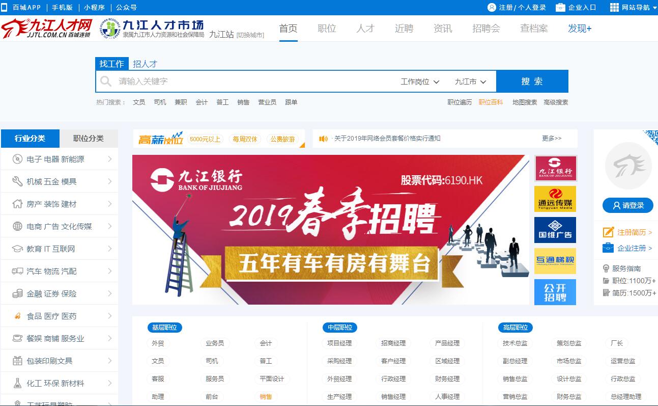 九江市人才交流服務(wù)中心隸屬于九江市人力資源和社會(huì)保障局,九江人才網(wǎng)(www.jjtl.com.cn)是九江市權(quán)威的政府官方專業(yè)人才網(wǎng)站,由九江市人才交流服務(wù)中心、九江市人才市場和百城招聘全國連鎖機(jī)構(gòu)聯(lián)合主辦運(yùn)營,隸屬九江市人力資源和社會(huì)保障局管理,是九江市政府官方人才網(wǎng)站,植根九江十五年,是贛北乃至江西地區(qū)訪問量超高、人氣超旺、招聘單位超多、簡歷庫超大、品牌知名度超高的網(wǎng)絡(luò)招聘平臺(tái),截至2015年底我們已經(jīng)累積擁有超過600萬份有效簡歷、350萬條涵蓋各行業(yè)的招聘職位。九江本土20多家江西省百強(qiáng)企業(yè)、5000多家中小企業(yè)及行業(yè)領(lǐng)軍企業(yè)、在九江的國內(nèi)外500強(qiáng)名企均選擇九江人才網(wǎng)。九江市人才市場成立于1985年,位于九江市北司路109號(hào),面積達(dá)4600余平方米,擁有南北二個(gè)招聘大廳,經(jīng)過30年的精心運(yùn)作,目前已經(jīng)成為贛北乃至江西地區(qū)規(guī)模超大的現(xiàn)場招聘集市,每月舉辦4場招聘會(huì)(固定每周五舉辦),每月進(jìn)場招聘單位總數(shù)達(dá)800家左右、入場找工作求職者達(dá)10000人次以上。十六年的網(wǎng)絡(luò)招聘經(jīng)驗(yàn)、成熟的現(xiàn)場招聘模式,網(wǎng)上、線下從高級(jí)人才到基層員工應(yīng)有盡有,網(wǎng)絡(luò)+現(xiàn)場o2o模式雙向出擊,一站式解決您的招聘難題。九江人才網(wǎng)擁有20人的專業(yè)服務(wù)團(tuán)隊(duì),貼心式的優(yōu)質(zhì)服務(wù)解決你的后顧之憂。