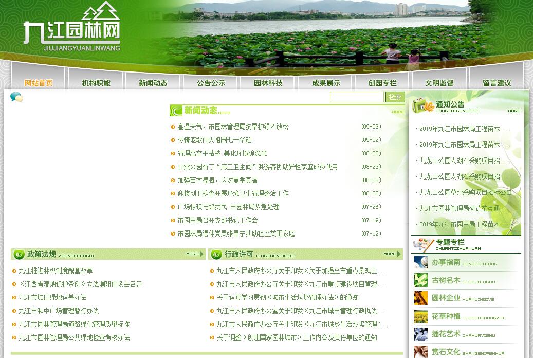 九江市園林管理局,為市建設規(guī)劃局副處級下屬事業(yè)單位。其主要職責是:(一)貫徹執(zhí)行國家和省有關城市綠化工作的方針、政策和法律、法規(guī);擬定園林綠化管理辦法并組織實施。(二)根據城區(qū)總體規(guī)劃,組織編制綠地系統(tǒng)詳細規(guī)劃和城市綠化專業(yè)規(guī)劃,確定城區(qū)各地段和各種性質用地的綠地率、人均公共綠地面積控制指標,組織實施城區(qū)綠化規(guī)劃,編制并實施城區(qū)綠化中長期發(fā)展規(guī)劃和年度計劃;參與城市綠地范圍控制線(綠線)的劃定工作,負責對綠線依法進行管理。(三)負責城區(qū)公共綠地、生產綠地、風景林地、行道樹、干道綠化帶及園林設施的規(guī)劃、建設、養(yǎng)護、管理;監(jiān)督、檢查、指導城區(qū)市屬、駐市各單位管界內的單位附屬綠地,單位、私營自建公園、居住區(qū)綠地的綠化規(guī)劃、建設和管理工作。(四)依法審批城區(qū)公共綠地、專用綠地、風景林地和干道綠化帶等綠化工程方案;依法審批城區(qū)新、改、擴建工程建設項目的附屬綠化工程設計方案,參與建設規(guī)劃行政主管部門對城區(qū)新建、改建、擴建工程項目建設方案的會審;負責城區(qū)新建、改建、擴建工程建設項目附屬綠化工程的方案審批和竣工驗收,負責城市規(guī)劃區(qū)內居住小區(qū)、單位庭院附屬綠化工程的方案審批和竣工驗收;制定綠化建設工程質量地方標準和綠化工程定額標準。(五)負責城區(qū)因建設需要樹木移植、砍伐和綠地臨時占用的勘察和初審,前置條件完備的,向上級主管部門申報。(六)負責城區(qū)古樹名木的鑒定、調查、統(tǒng)計、建檔及對古樹名木養(yǎng)護的監(jiān)督、指導,救護及繁殖瀕危植物和做好城區(qū)野生動物的救助工作。(七)做好園林綠化行業(yè)職工培訓、繼續(xù)教育和人才開發(fā)、園林綠化科學研究、科技成果推廣應用和新技術引進工作。(八)負責城區(qū)園林綠化、動物科普教育宣傳工作,負責本局綠化統(tǒng)計、成果普查、資源調查評估和檔案管理工作。(九)負責12319市民熱線求助的處理工作。(十)完成上級交辦的其他工作。