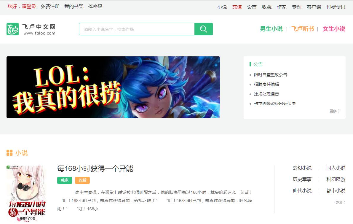 | 網(wǎng)站簡介: 《飛盧中文網(wǎng)》提供原創(chuàng)小說閱讀,包括:輕小說,玄幻小說,同人小說,穿越小說、青春校園小說等精彩很Hi的小說在線閱讀及小說下載。頁面簡潔,無眩雜廣告。 |