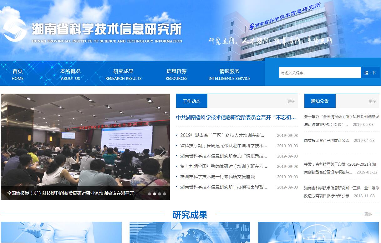 湖南省科技信息研究所成立于1959年,是湖南省科技廳主管的省級科研事業(yè)單位,全省唯一的國家一級查新單位,科技信息(情報)研發(fā)、咨詢、服務(wù)中心,承擔著科技信息采集與加工、科技數(shù)據(jù)統(tǒng)計與分析、科技發(fā)展戰(zhàn)略研究、科技情報產(chǎn)品生產(chǎn)、科技情報人才培養(yǎng)、政府部門科技決策支持、企業(yè)和科研單位等科技創(chuàng)新主體信息(情報)服務(wù)、市州和行業(yè)科技情報機構(gòu)業(yè)務(wù)指導(dǎo)等重要職能。湖南省科技信息研究所現(xiàn)有在職職工119人,其中研究員6人,副研究員19人,中級職稱技術(shù)人員49人,專業(yè)技術(shù)人員所學(xué)專業(yè)涵蓋理學(xué)、工學(xué)、農(nóng)學(xué)、醫(yī)學(xué)、哲學(xué)、管理學(xué)、經(jīng)濟學(xué)等多個學(xué)科,形成了一支業(yè)務(wù)水平高、專業(yè)門類齊全、研究咨詢力量雄厚的專職科技情報研究隊伍。