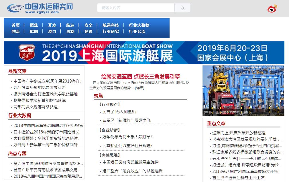 中國水運(yùn)研究網(wǎng)是由中國水運(yùn)報(bào)刊社主辦的綜合性行業(yè)信息網(wǎng)站,也是《中國水運(yùn)》雜志的官方網(wǎng)站,以交通水運(yùn)行業(yè)信息為資源,以打造中國水運(yùn)行業(yè)資源平臺(tái)為理念,依托自身掌握的政府資源、行業(yè)資源和關(guān)聯(lián)資源,旨在積極宣傳黨和政府發(fā)展水運(yùn)的方針政策,闡釋國際國內(nèi)水運(yùn)法律法規(guī),普及推廣水運(yùn)科技成果,分析水運(yùn)市場經(jīng)濟(jì)形勢(shì),提供水上安全指南,反映兩個(gè)文明建設(shè)成就。中國水運(yùn)研究網(wǎng)目前設(shè)置有聚焦、開發(fā)、航運(yùn)、安全、政策解讀、行業(yè)大數(shù)據(jù)、物流、船舶、港口、法制、建設(shè)、行業(yè)研究、行業(yè)名流等主要欄目,已成為了解我國水運(yùn)發(fā)展和國際航運(yùn)形勢(shì)的重要窗口,以及水運(yùn)工作者和相關(guān)業(yè)界人士的參考文獻(xiàn)。